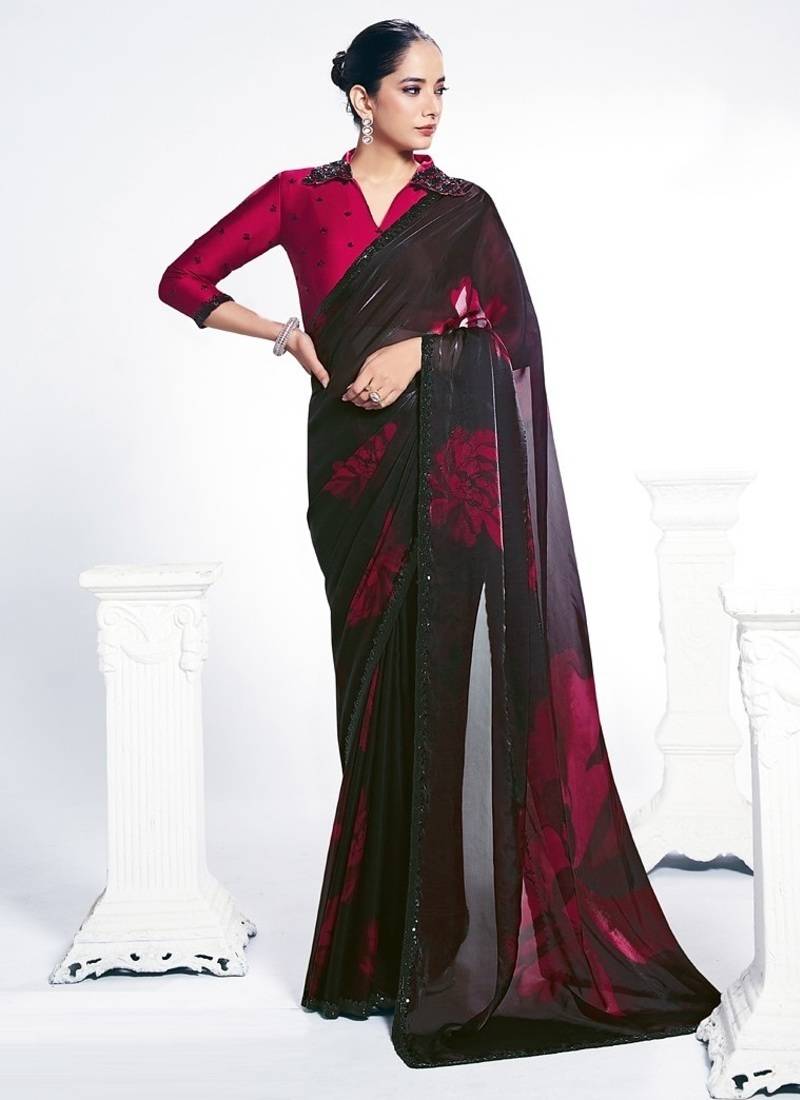 Product Name | Ruby Red & Black Two Tone Satin Silk Digital Printed Embroidery Saree | |