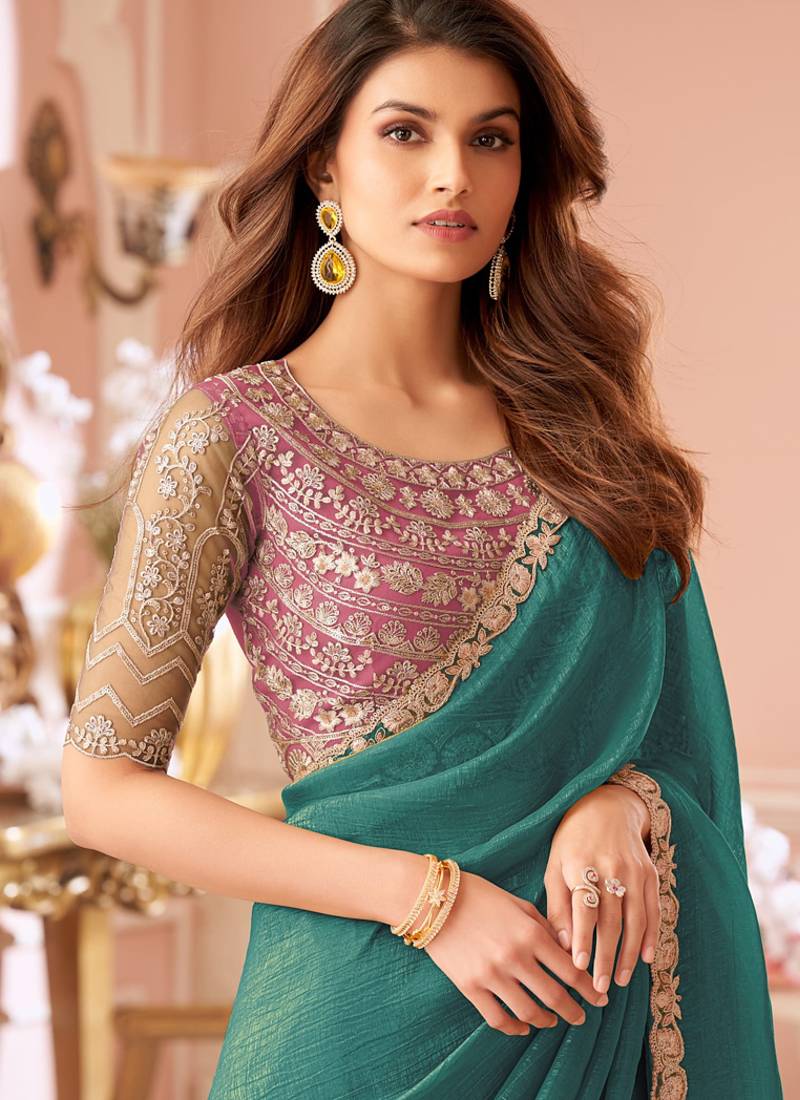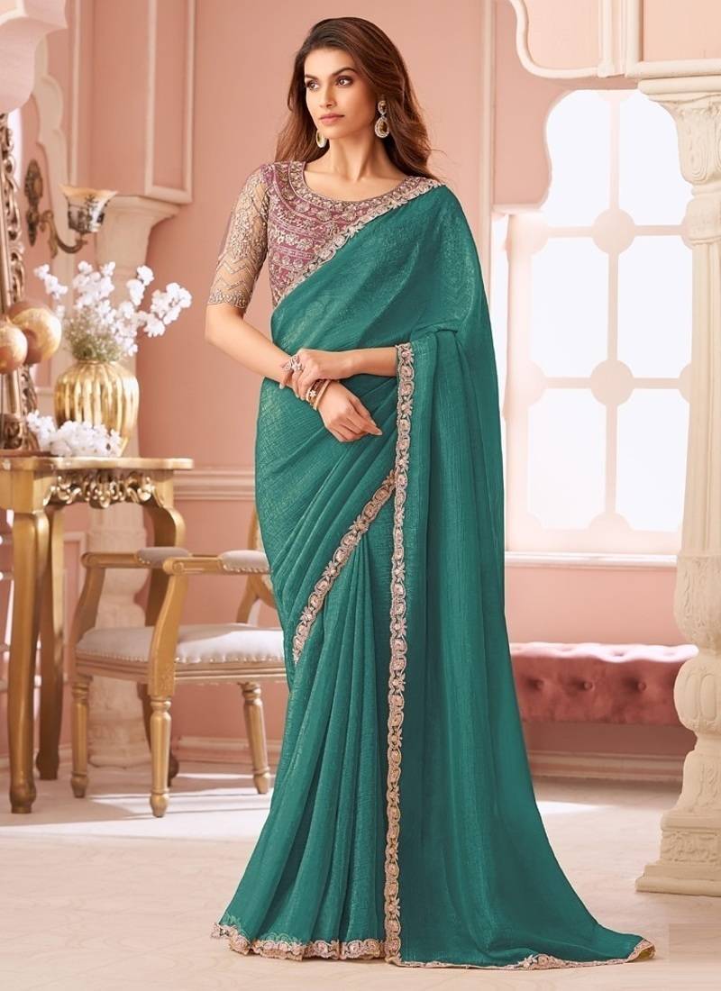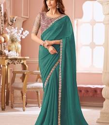 Sea green georgette resham & cut work border heavy designer blouse party wear saree