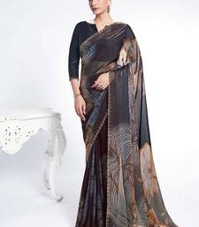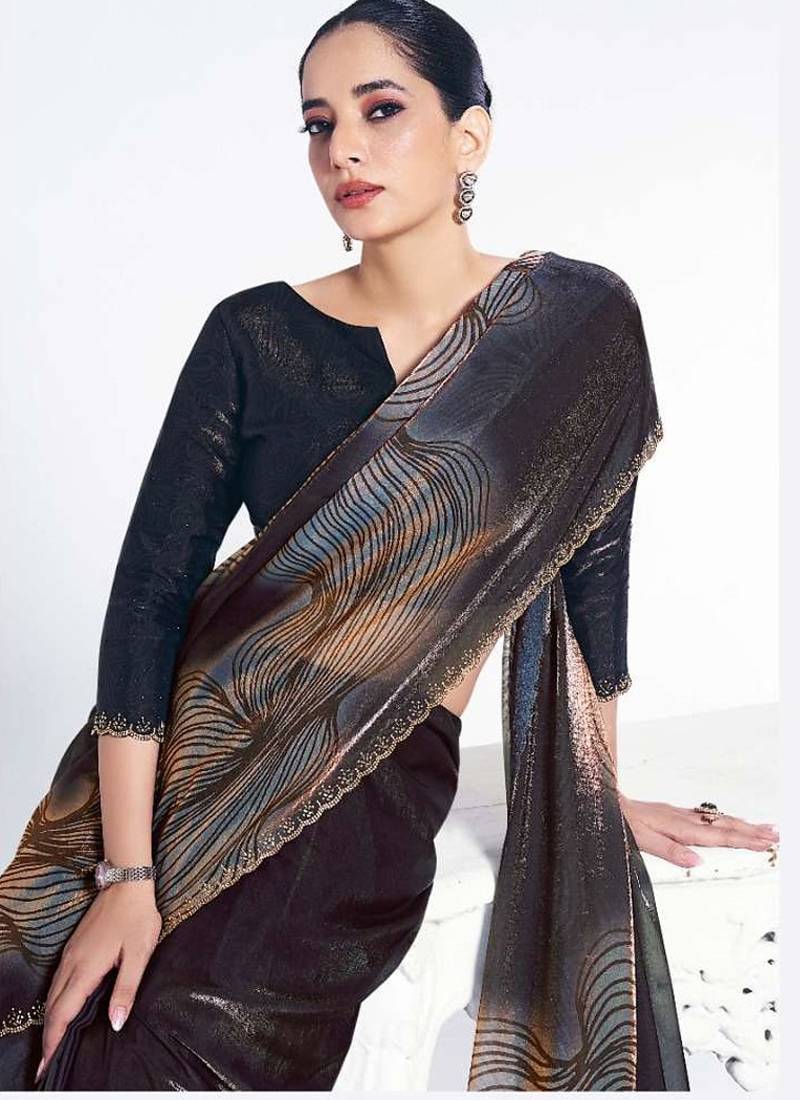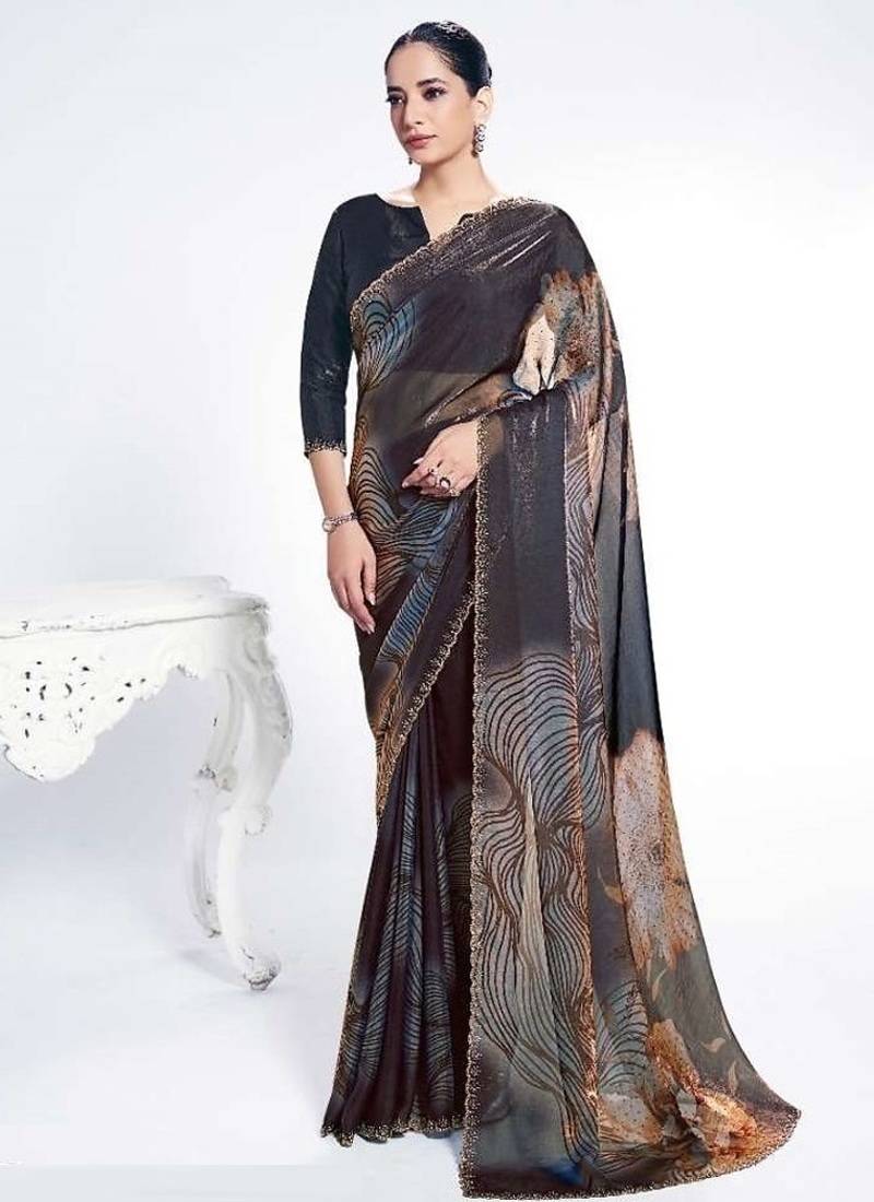 Shaded black satin silk digital print serocky stone work party wear saree