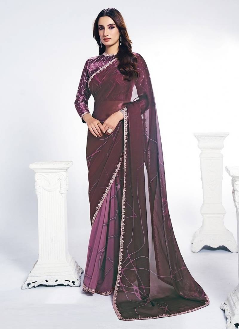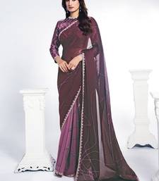 Shaded wine two tone satin silk digital print with sequince hand work saree