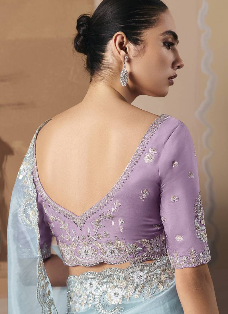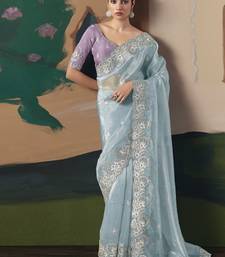 Sky blue glass tissue silk sequince & resham work cut work border heavy designer saree