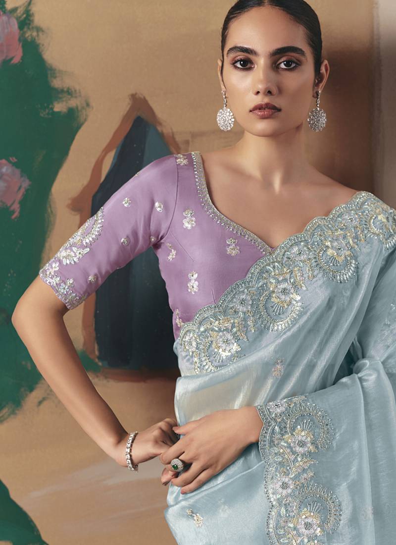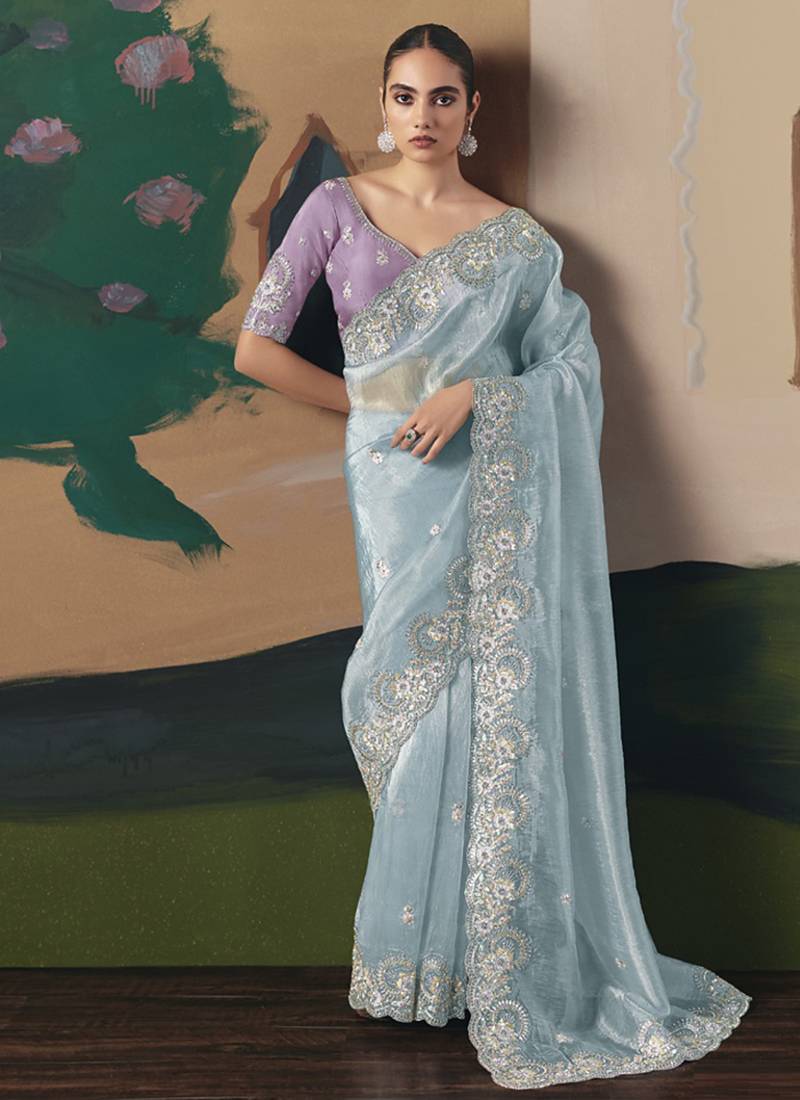 Product Name | Sky Blue Glass Tissue Silk Sequince & Resham Work Cut Work Border Heavy Designer Saree | |