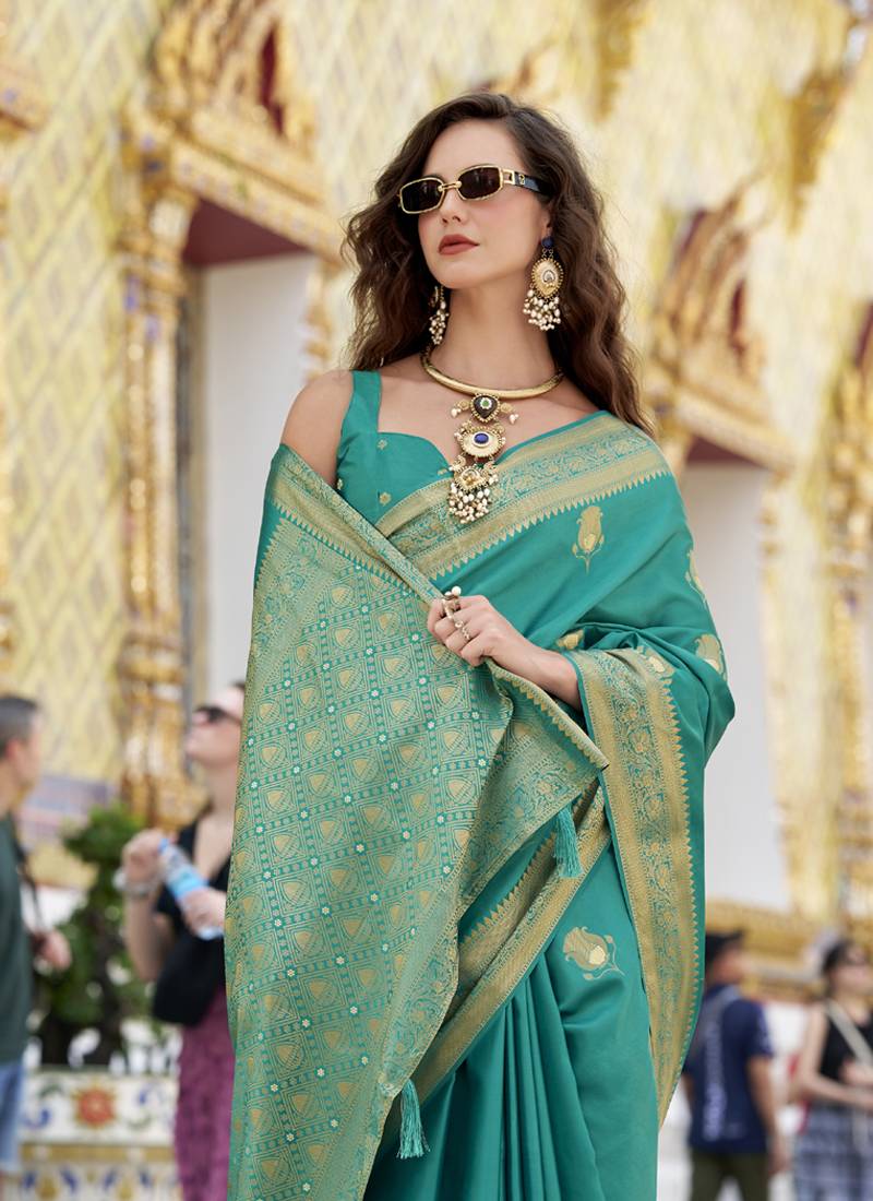 | Product Name | Turquoise Satin Silk Blend With Beautiful Zari Weaving Border & Designer Pallu | |