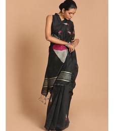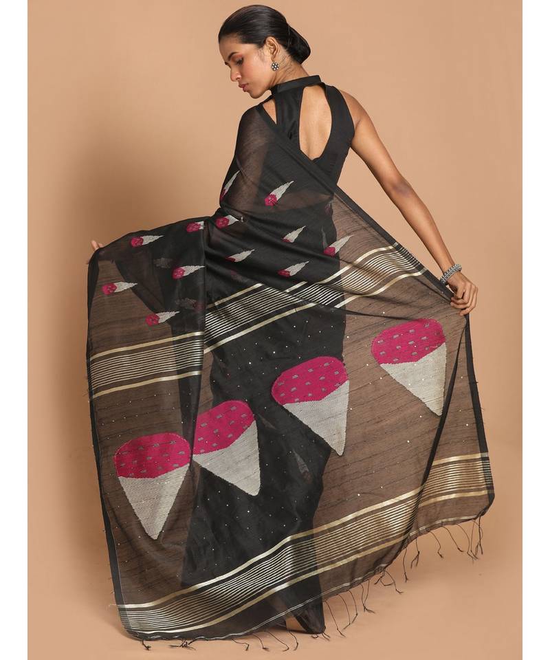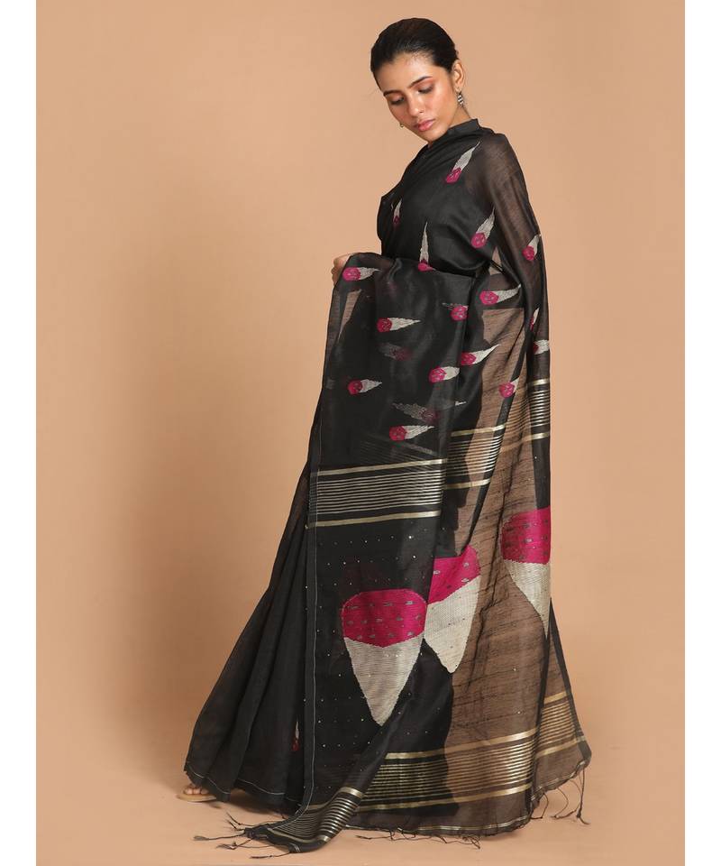Black bengal handloom cotton blend work saree with blouse