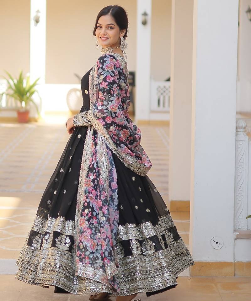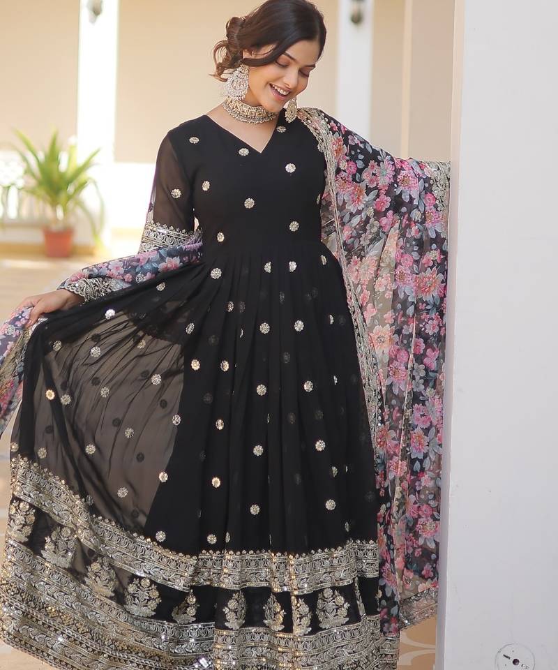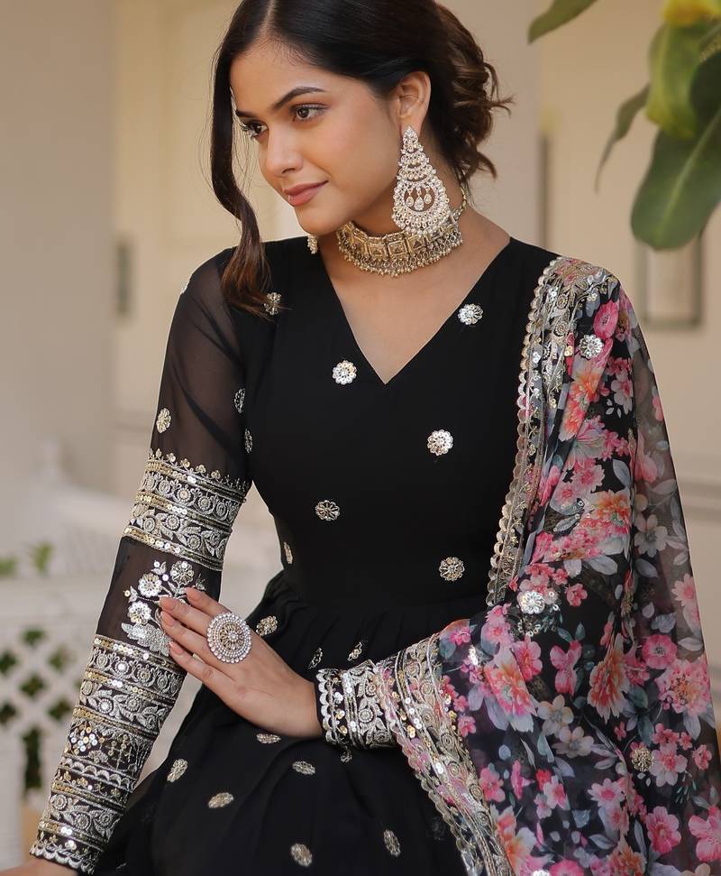 | Product Description | Make A Bold Statement With This Black Fox Georgette Gown, Paired With A Rich Tabby Silk Dupatta. Featuring Exquisite Zari & Sequins Embroidery On Both Gown And Dupatta, This Premium Outfit Delivers A Grand Designer Look For Weddings, Receptions, And Evening Celebrations. |