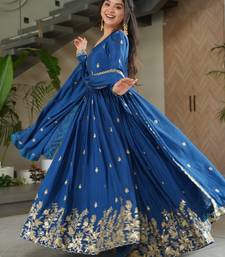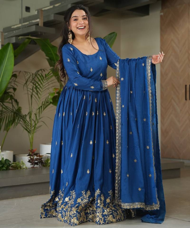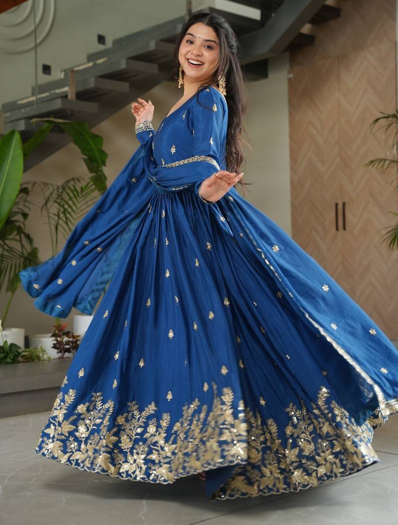 | Product Name | Blue Chinnon Heavy Zari Sequins Embroidered Designer Gown With Matching 2.25m Sequins Dupatta | |