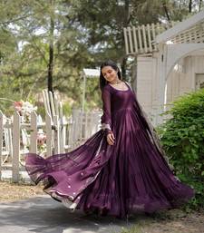 This Wine Colored Designer Gown With Dupatta Is Crafted From High Quality Faux Blooming Fabric And Enhanced With Elegant Sequence Embroidery. The Gown Features A Full 56 Inch Stitched Length, Offering A Comfortable, Ready To Wear Fit With A Smooth Drape. Its Plain Body And Subtle Shimmer From The Embroidery Create A Balanced And Graceful Look Suitable For Various Occasions.