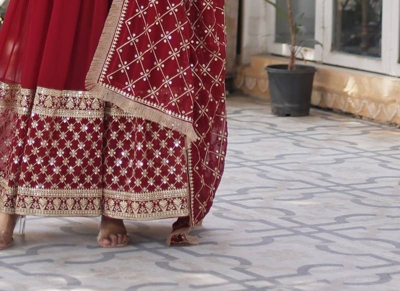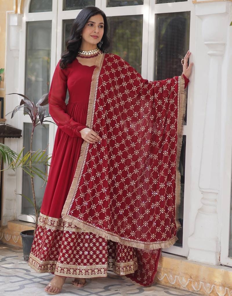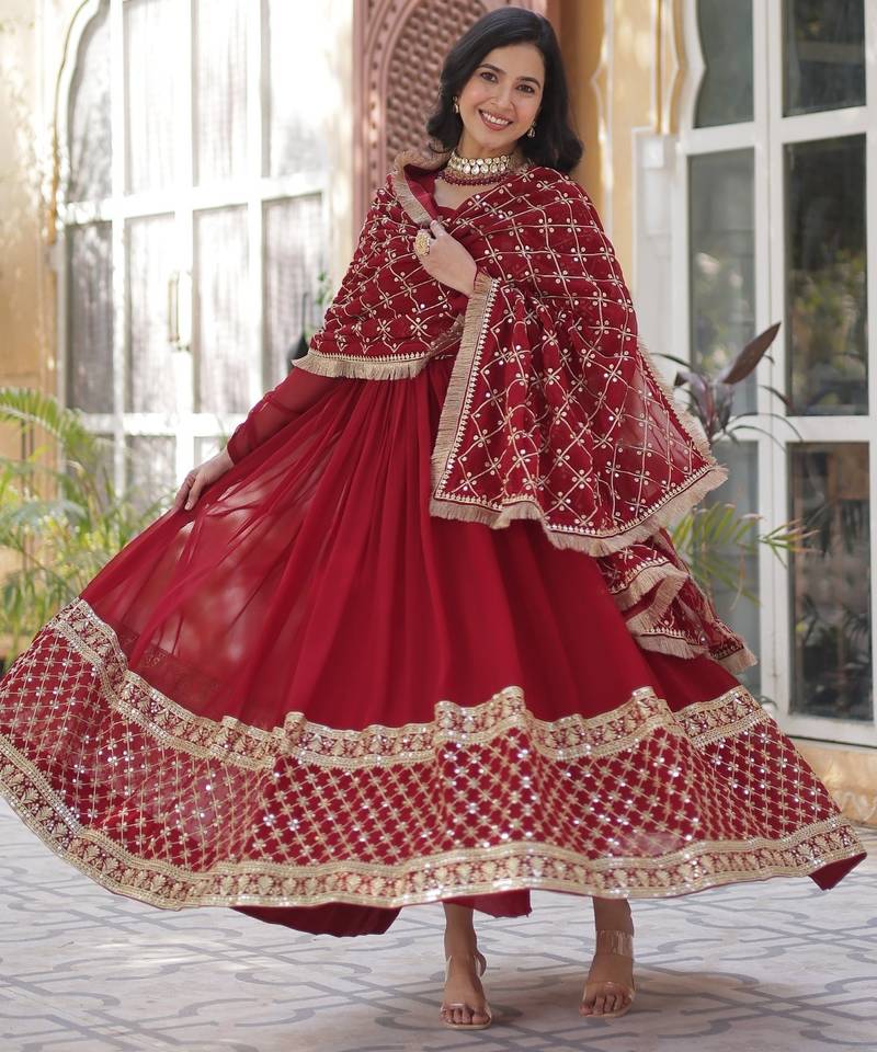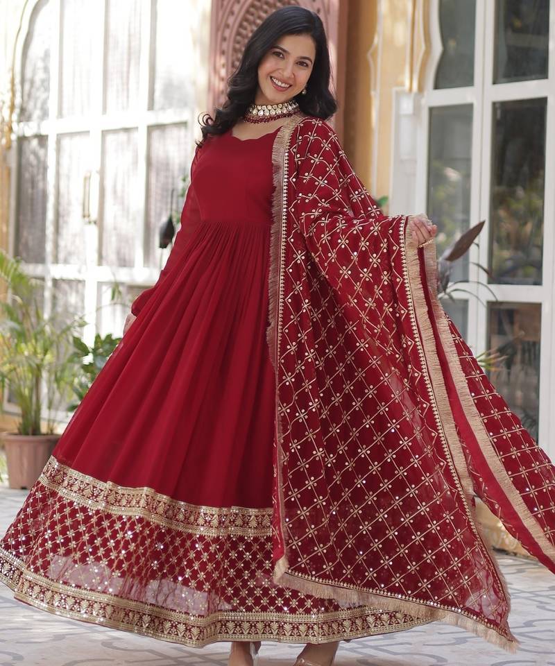 | Product Name | Maroon Faux Blooming Designer Gown With Heavy Zari Sequins Embroidery & Matching Lace Border Dupatta | |