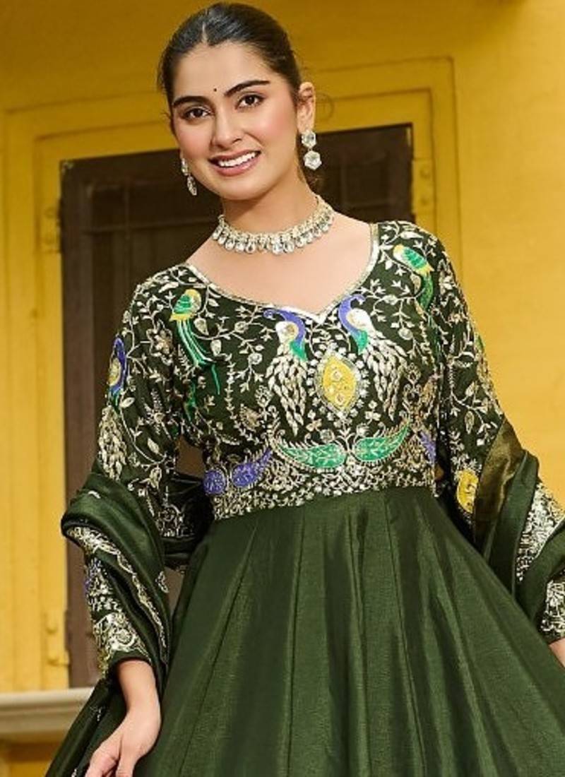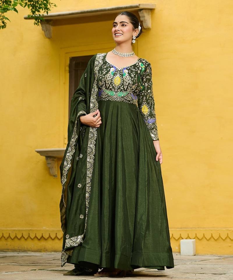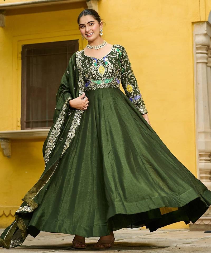 | Product Name | Mehendi Vichitra Silk Designer Gown With Zari Embroidery | Festive & Wedding Wear Gown | |
