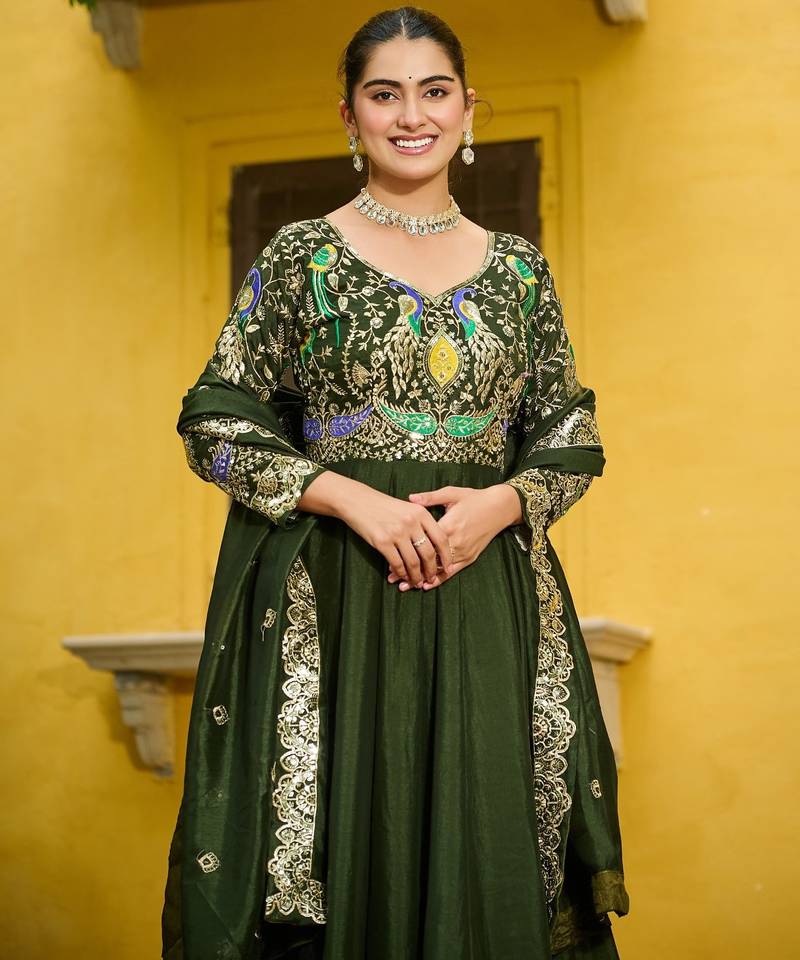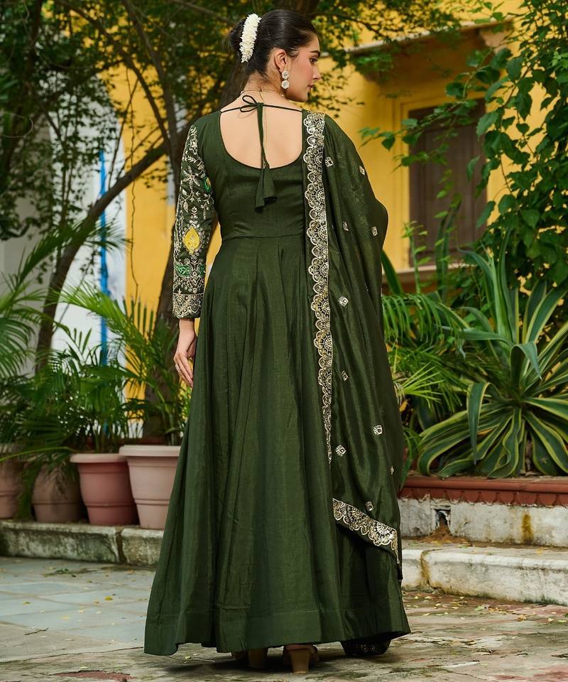 | Product Description | Experience Timeless Elegance With This Mehendi Vichitra Silk Designer Gown, Crafted To Bring Out A Sophisticated Festive Charm. Made With Premium Vichitra Fabric, The Gown Offers A Graceful Drape, Smooth Texture, And Luxury Appeal—Perfect For Weddings, Receptions, And Traditional Occasions. The Outfit Is Beautifully Enhanced With Zari Embroidery Work, Giving It A Rich, Royal Look Ideal For Premium Celebrations.
