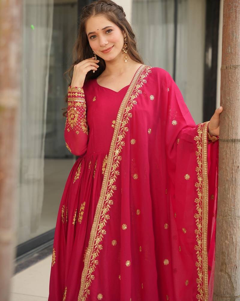 | Product Description | Experience Elegance With This Pink Star Georgette Designer Gown, Crafted With Rich Zari And Sequins Embroidery For A Premium Festive And Party Wear Look.