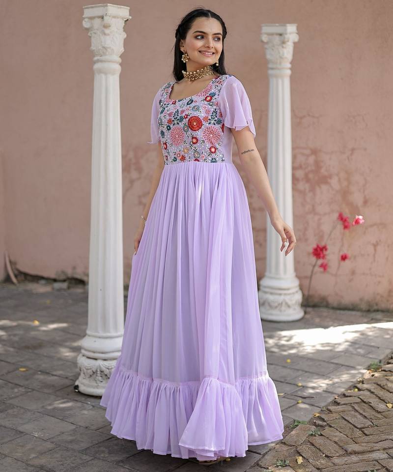 | Product Description | This Stunning Purple Faux Georgette Gown Combines Elegant Embroidery With Shimmering Sequins, Giving You A Graceful Party Ready Outfit. Its Rich Color And Lightweight Flowy Fabric Make It A Perfect Pick For Festive Occasions And Stylish Celebrations. |