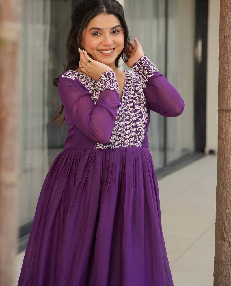 | Product Name | Purple Star Georgette Gown With Bead & Sequin Embroidery | Fully Stitched Women’s Partywear & Festive Gown | |