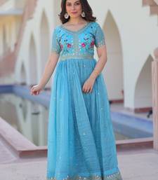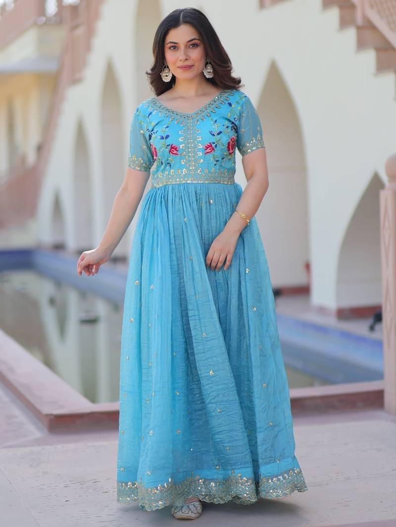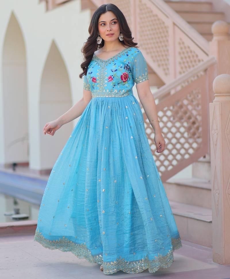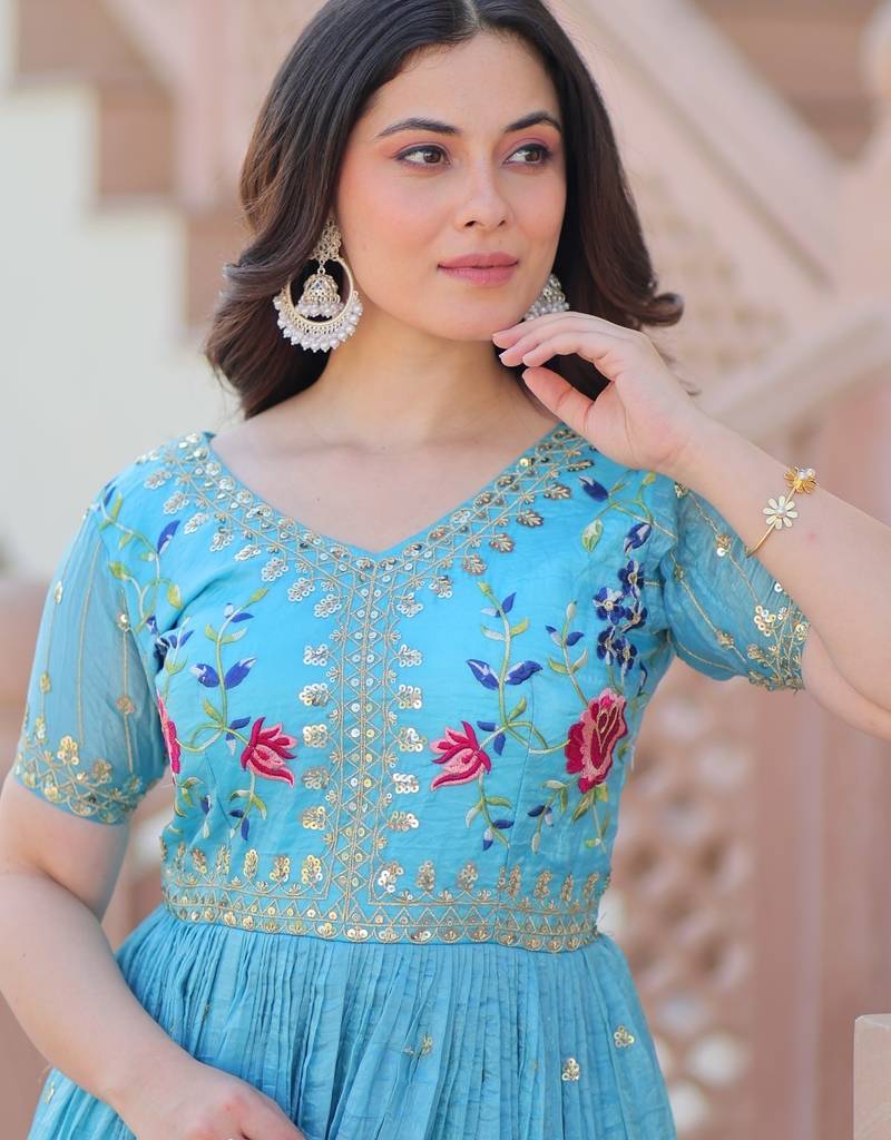 With Its Fully Stitched Finish And Comfortable Fit, This Gown Ensures Ease Of Movement While Maintaining A Graceful Silhouette. The Sky Blue Color Brings A Fresh, Charming Look Suitable For All Skin Tones, Making It A Versatile Addition To Your Ethnic Collection.