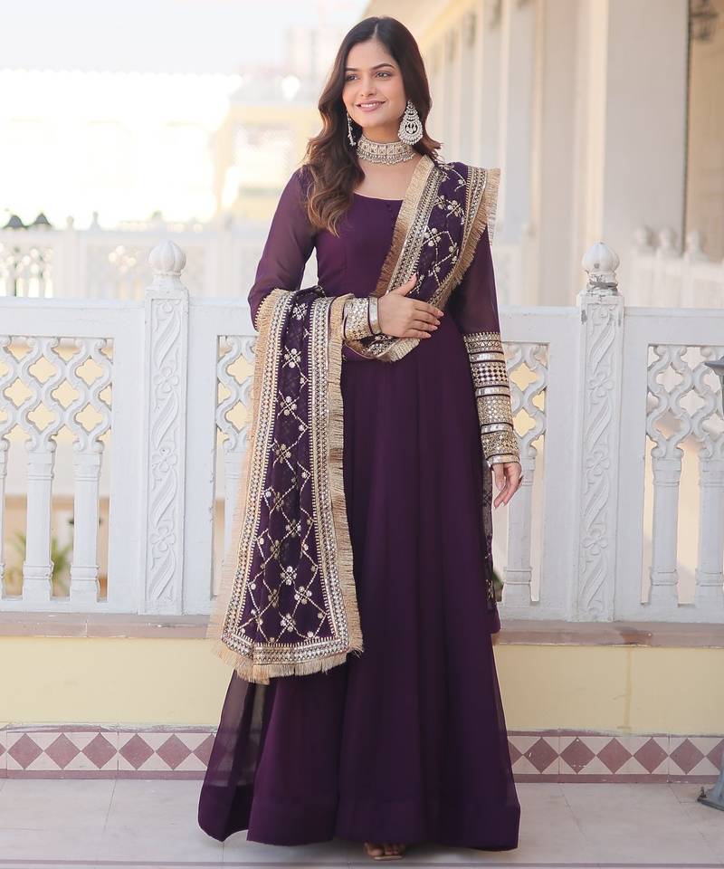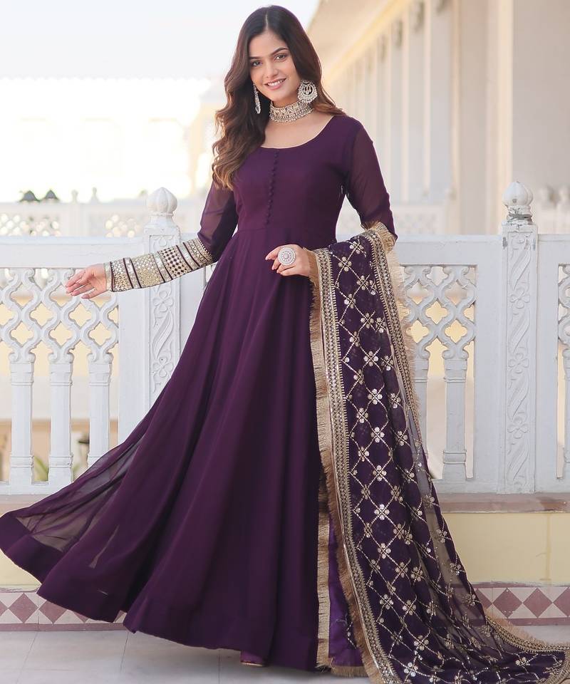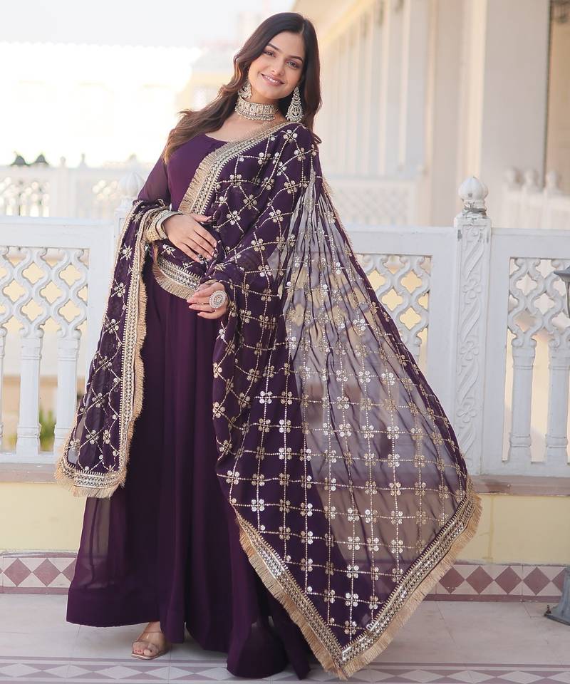 | Product Description | Elevate Your Festive Wardrobe With This Wine Faux Blooming Gown, Crafted With Luxurious Sequin And Embroidery Detailing. Paired With A Beautifully Worked Dupatta, This Outfit Delivers A Graceful Yet Grand Look—Perfect For Celebrations And Evening Functions. |