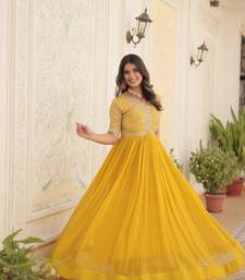 | Product Description | A Vibrant Yellow Designer Gown Crafted From Premium Faux Blooming Fabric, Elevated With Intricate Sequin & Embroidery Work. This Radiant Outfit Delivers A Fresh Festive Appeal—Perfect For Haldi Ceremonies, Weddings, Receptions, Parties, And All Joyous Celebrations. |
