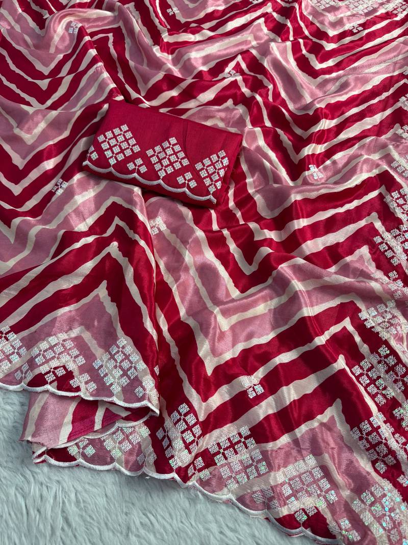 | Product Description | This Stunning Saree Is Crafted From Premium Chinon Fabric And Features An Elegant Lehriya Design Pattern That Creates A Graceful And Flowing Look. The Saree Is Beautifully Enhanced With Heavy Thread And Sequins Work, Adding Rich Texture And A Glamorous Finish. Soft, Lightweight, And Easy To Drape, It Is Perfect For Festive Occasions, Weddings, And Evening Parties. The Saree Comes Paired With A Mono Banglori Blouse, Completing The Ensemble With A Stylish And Coordinated Appeal. |