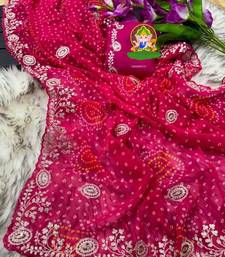 Soft georgette bandhani print saree with pitha work embroidery & mono bangalori blouse
