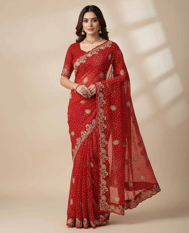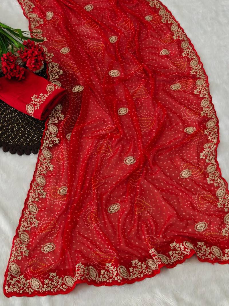 Soft georgette bandhni print saree with sober pitha work embroidery red saree with blouse piece