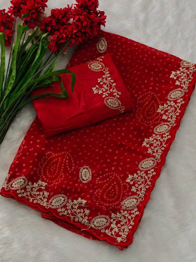 | Product Name | Soft Georgette Bandhni Print Saree With Sober Pitha Work Embroidery Red Saree With Blouse Piece | |