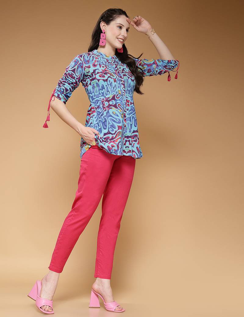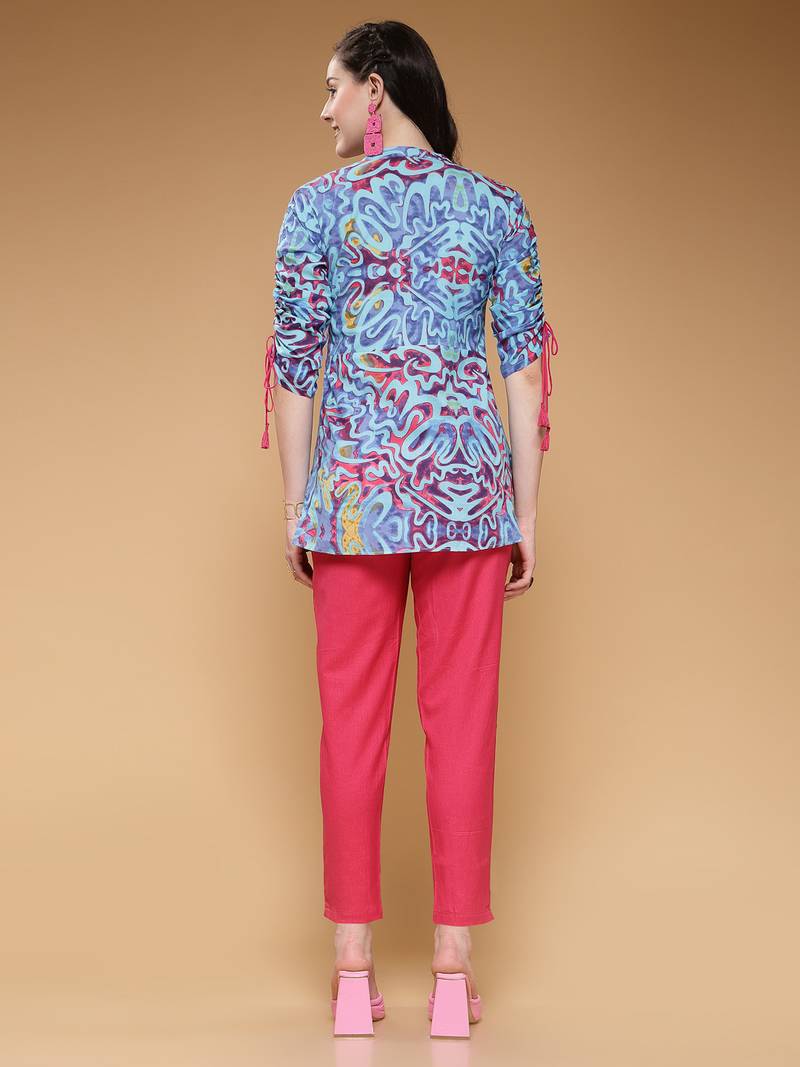 | Product Description | Women Cotton Blue Abstract Print Co Ord Set, Has A Mandarian Collar With Front Button Closure And Pintucks, Three Quarter Sleeve With Contrast Dori, Straight Trouser With Half Elasticated Waist Band And Button Zip Closure |