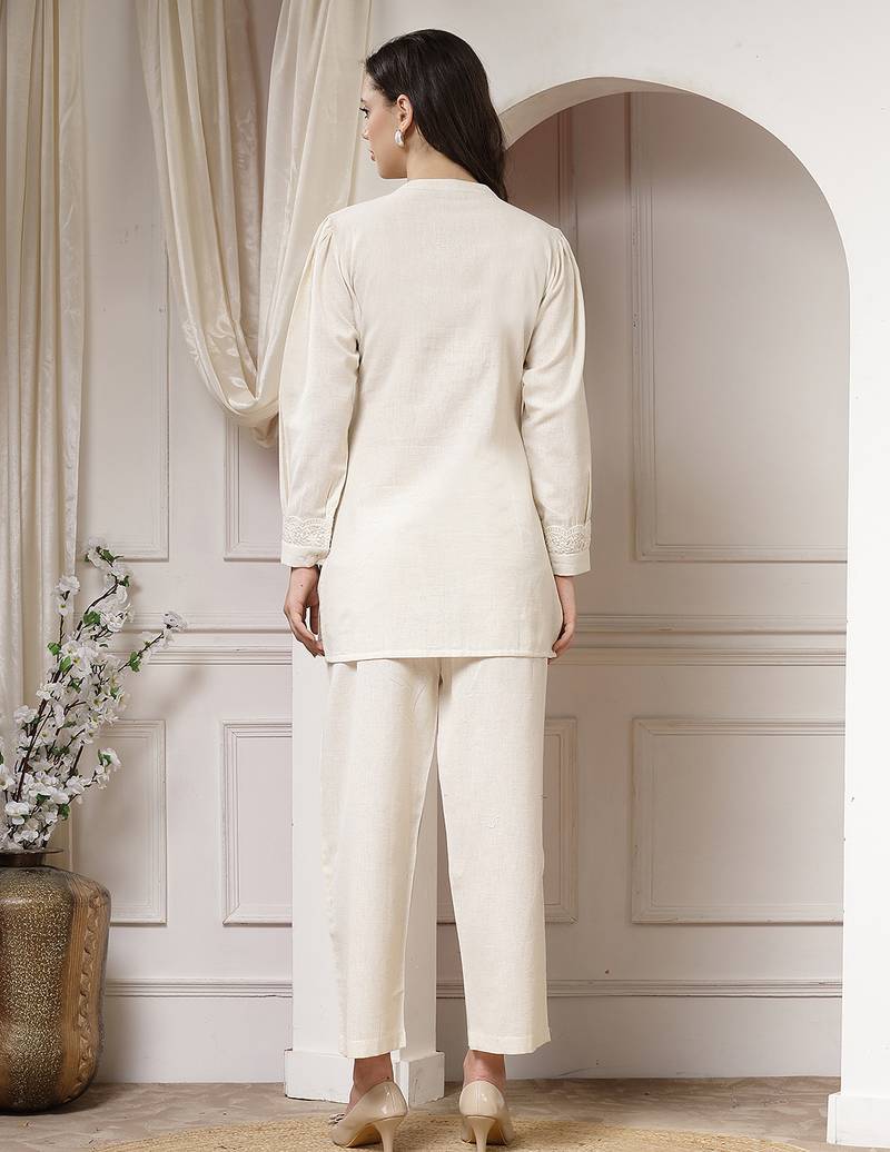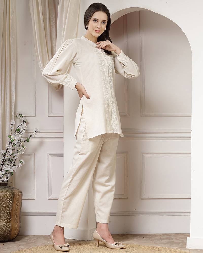 | Product Description | Women Cotton Natural Flex Solid Co Ord Set, Has A Mandarin Collar With Organza Embroidered Lace And Front Button Closure, Full Cuff Sleeve With Lace Details At Cuff, Side Slit Straight Hemline Co Ord Set |