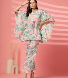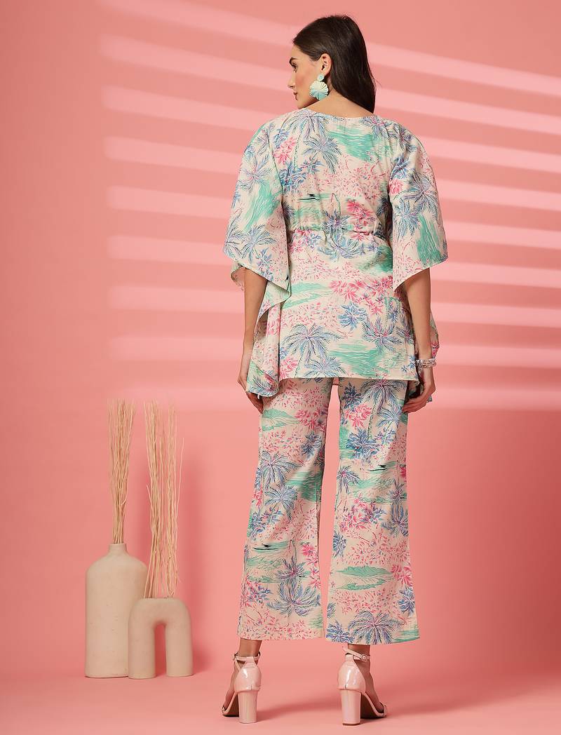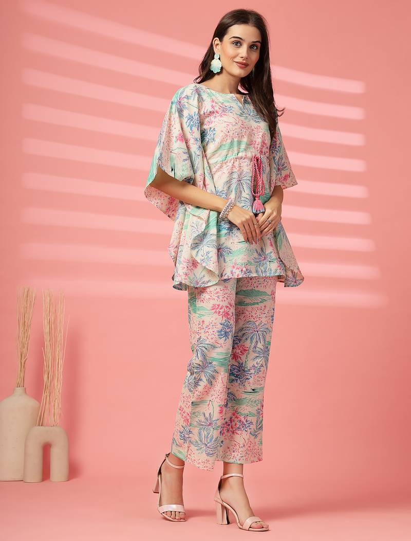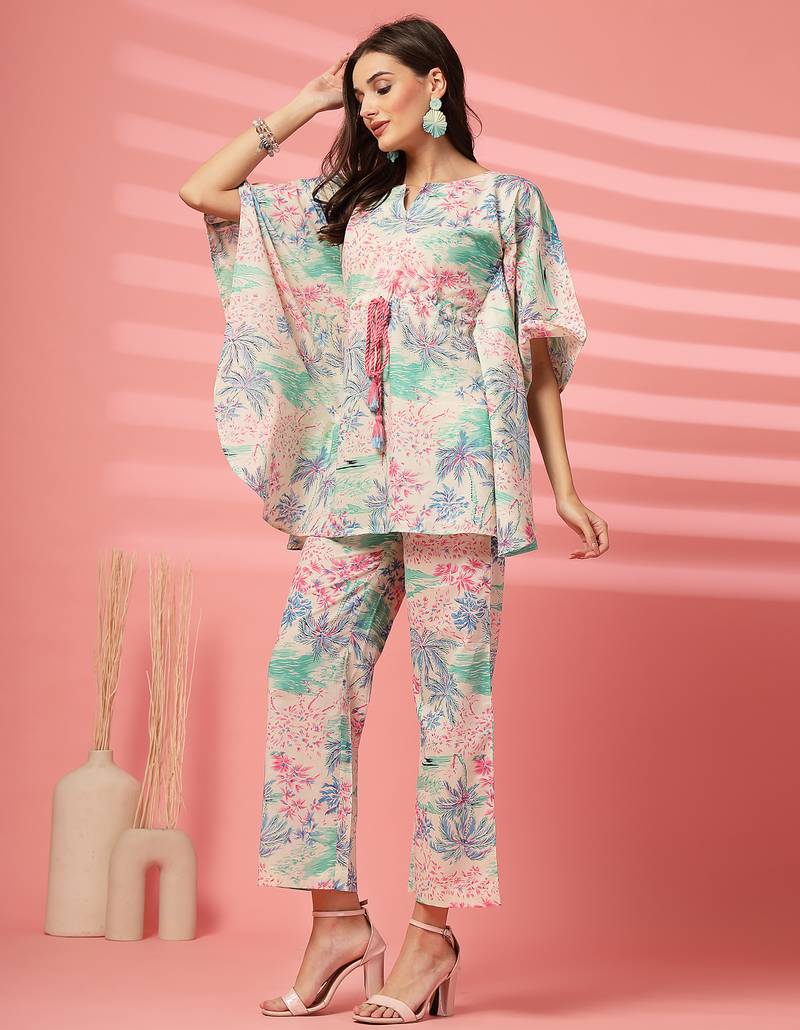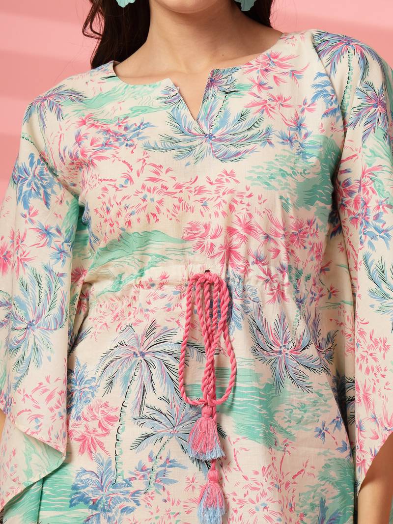 | Product Description | Indibelle Cotton Pink Tropical Print Co Ord Set, A Keyhole Neck With Tie Up Contrast Dori Kaftan With Straight Fit Trouser, Mid Thigh Length Kaftan With Two Side Pocket Trouser |