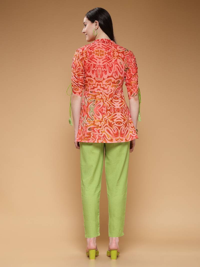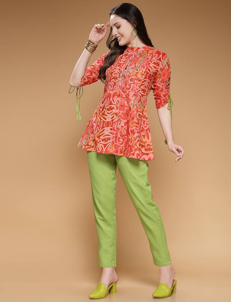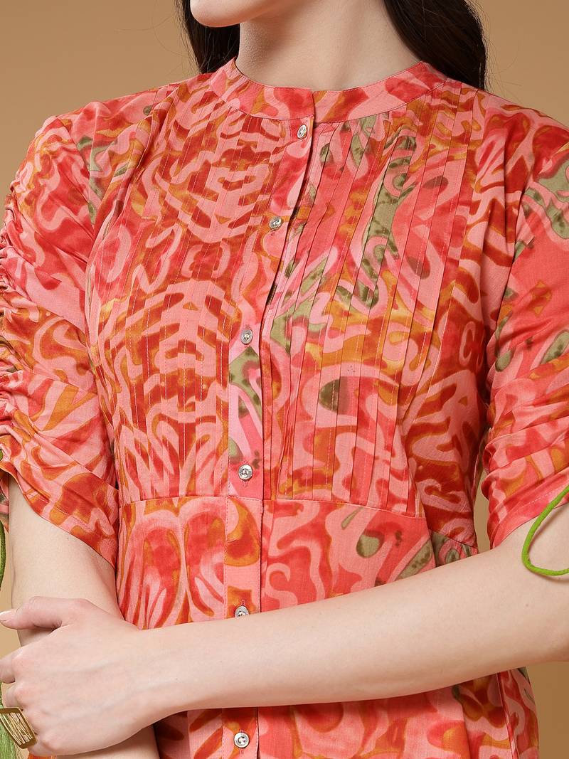 | Product Description | Women Cotton Red Abstract Print Co Ord Set, Has A Mandarian Collar With Front Button Closure And Pintucks, Three Quarter Sleeve With Contrast Dori, Straight Trouser With Half Elasticated Waist Band And Button Zip Closure |