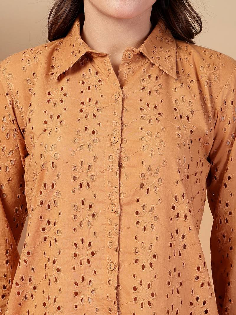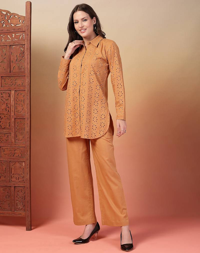 | Product Description | Indibelle Cotton Schiffli Solid Brown Shirt Collar With Front Button Open, Front Lining Attached With Schiffli And Palin Back, Mid Thigh Length Shirt Collar With Straight Trouser Co Ord Set |