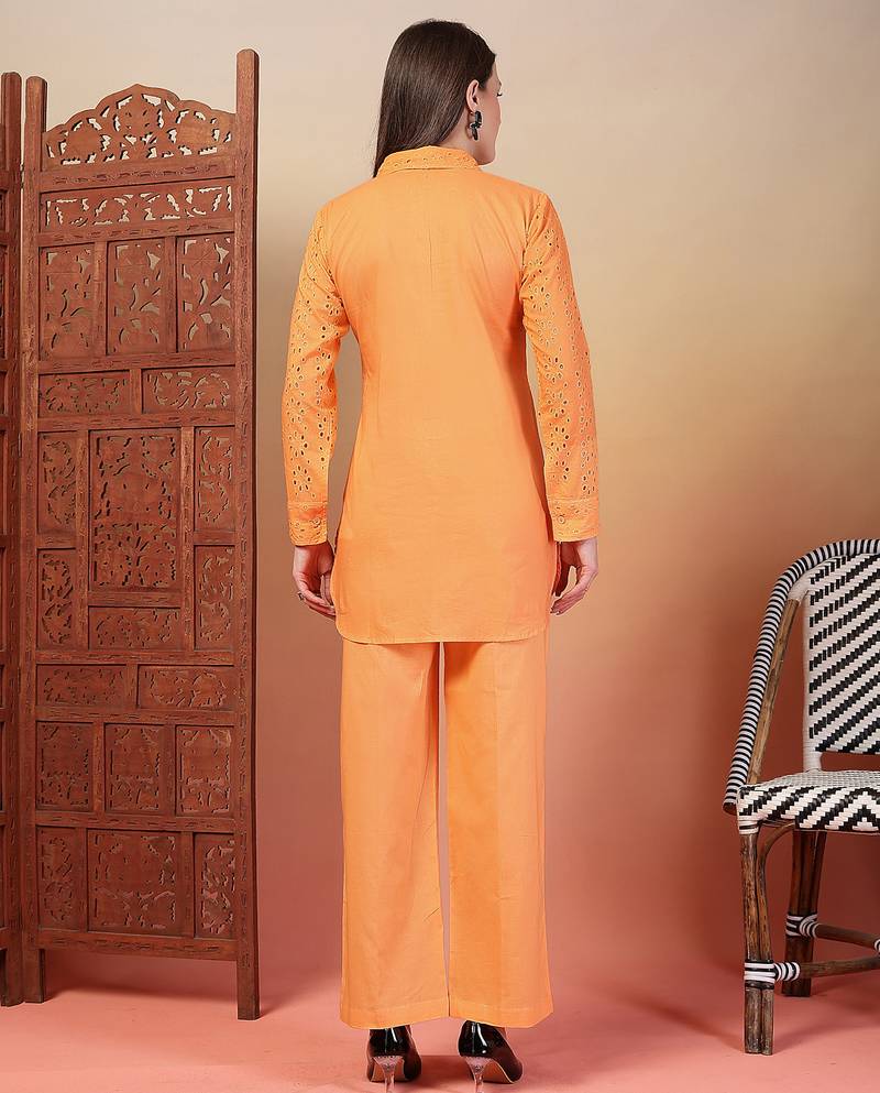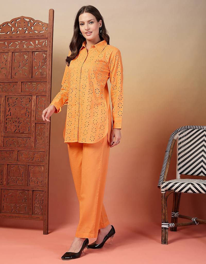 | Product Description | Indibelle Cotton Schiffli Solid Orange Shirt Collar With Front Button Open, Front Lining Attached With Schiffli And Palin Back, Mid Thigh Length Shirt Collar With Straight Trouser Co Ord Set |