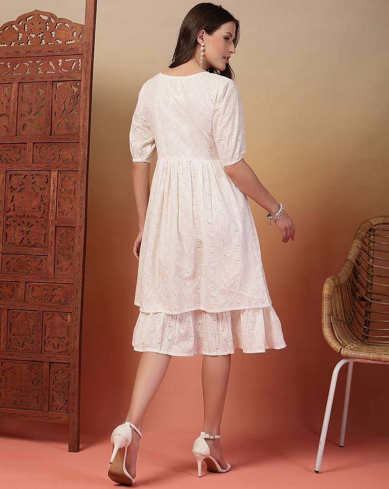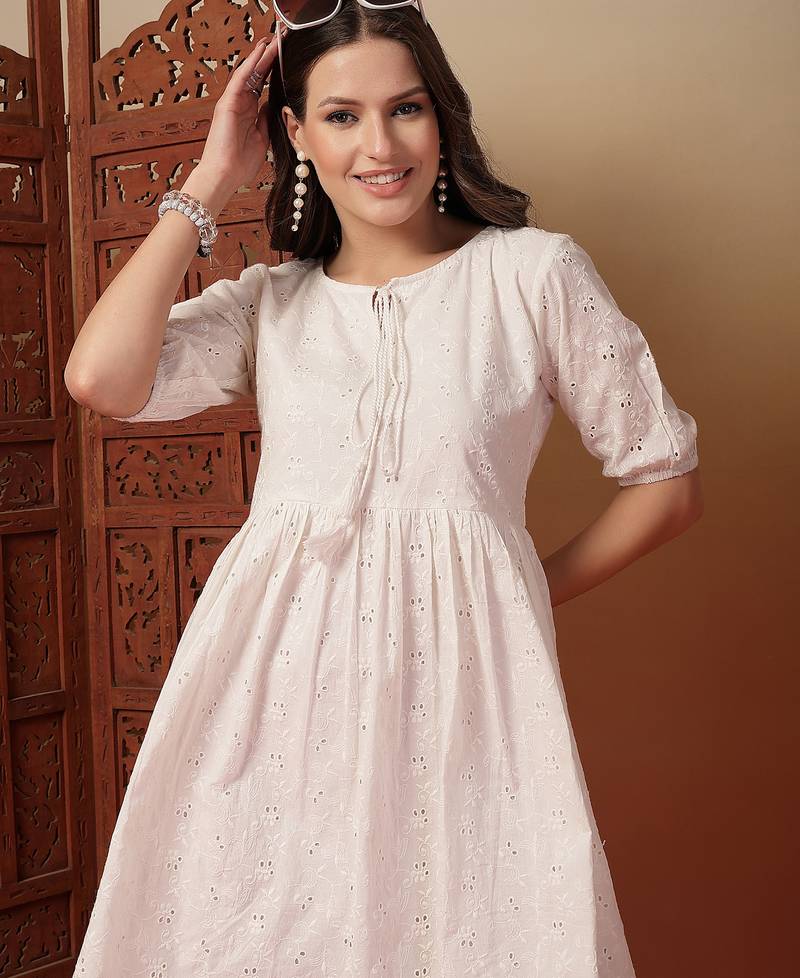 | Product Description | Indibelle Cotton Schiffli White Tie Up Round Neck With Elbow Puff Sleeve, Second Frill Is Attached On The Lining Of The Dress, Calf Length Schiffli Dress |