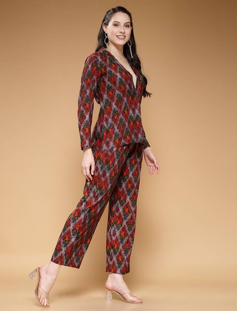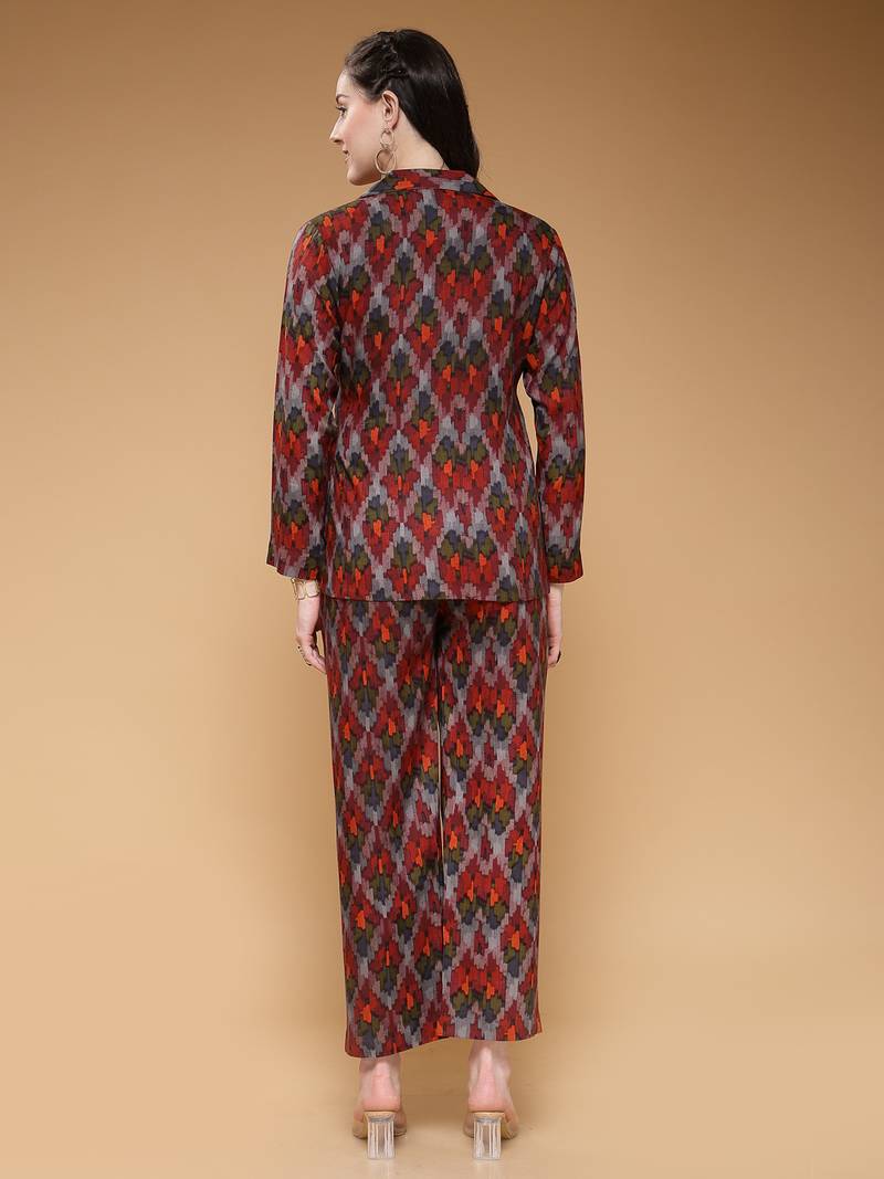 | Product Description | Women Rayon Maroon Abstract Print Co Ord Set, Has A Notch Collar With One Button Closure And Full Sleeve, Straight Trouser With Half Elasticated Band And Two Side Pockets |