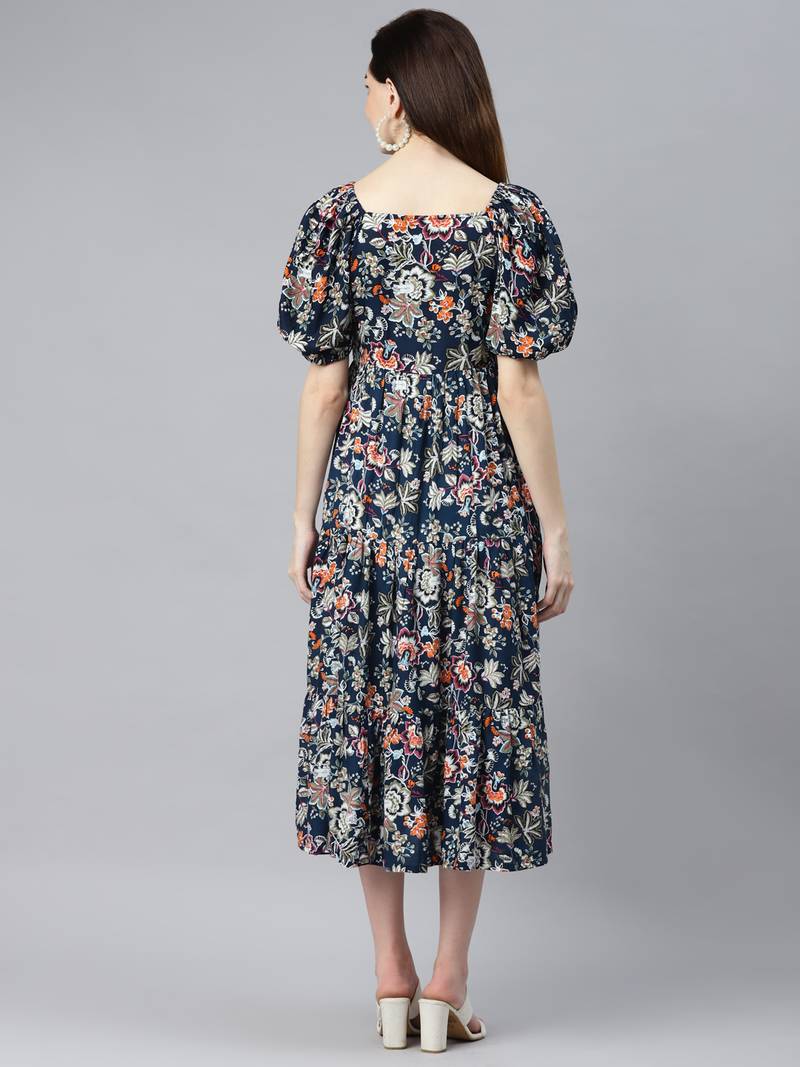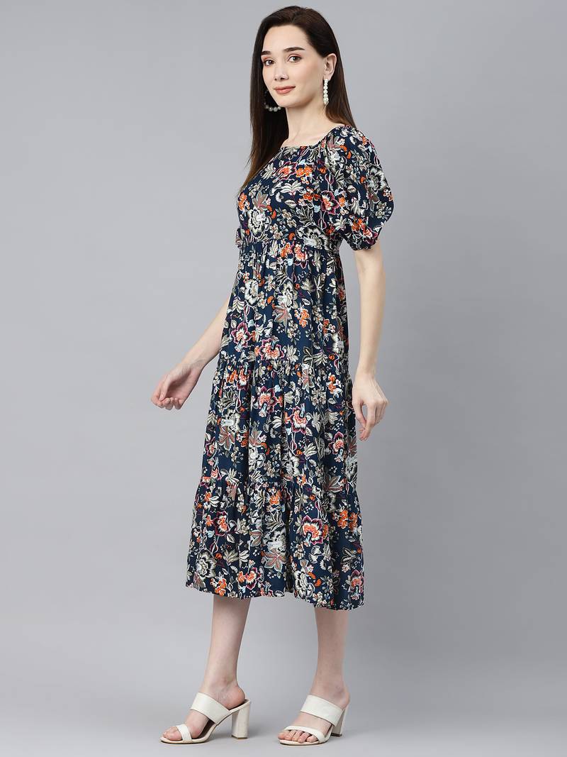 Indibelle Rayon Blue Floral Print, U Neck, Elbow Balloon Sleeve With Elastic, Two Tiered, Flared Hemline, Calf Length Dress