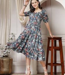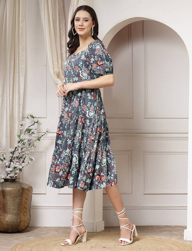| Product Description | Indibelle Rayon Grey Floral Print, U Neck, Elbow Balloon Sleeve With Elastic, Two Tiered, Flared Hemline, Calf Length Dress |