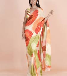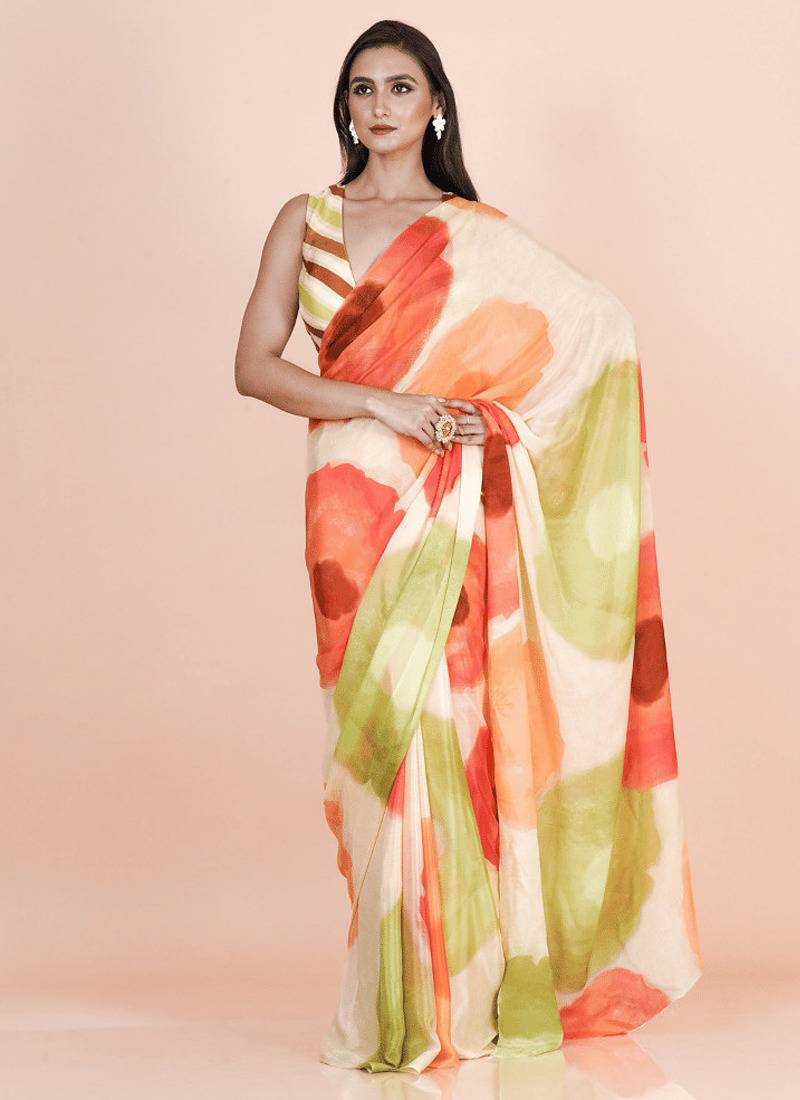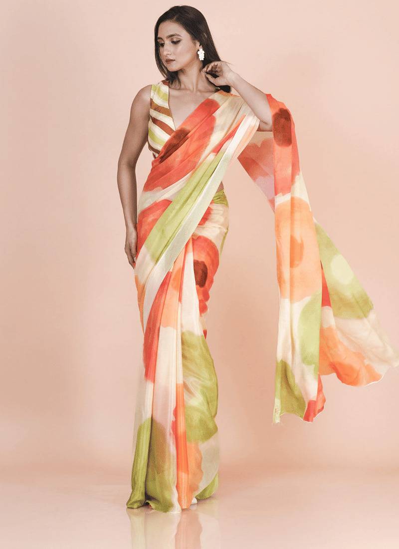 Multi coloured abstruct styled artistic digital printed chinnon silk saree with blouse