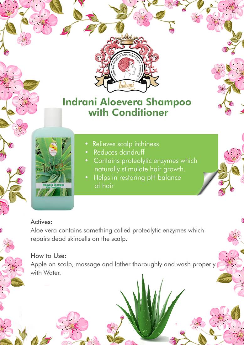 | Product Description | Indrani Aloe Vera Shampoois Very Mild And It Helps To Get Rid Of The Dirt And Grime In The Hair, Without Depleting The Scalp Of Its Natural Oils, Leaving The Strands Smooth, Shiny And Glowing Withhealth. It Minimises Hair Fall And Promotes Hair Growth |