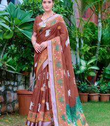 Brown printed pure cotton brown saree with blouse