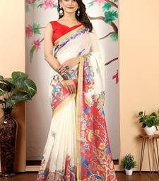 White printed pure cotton white saree with blouse