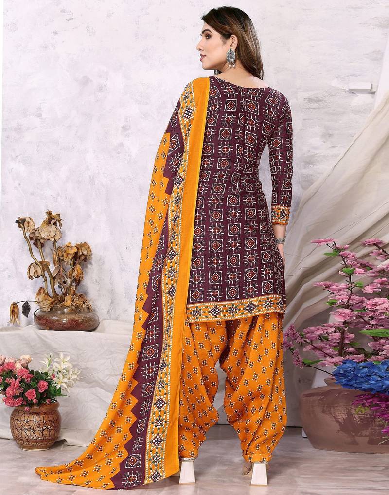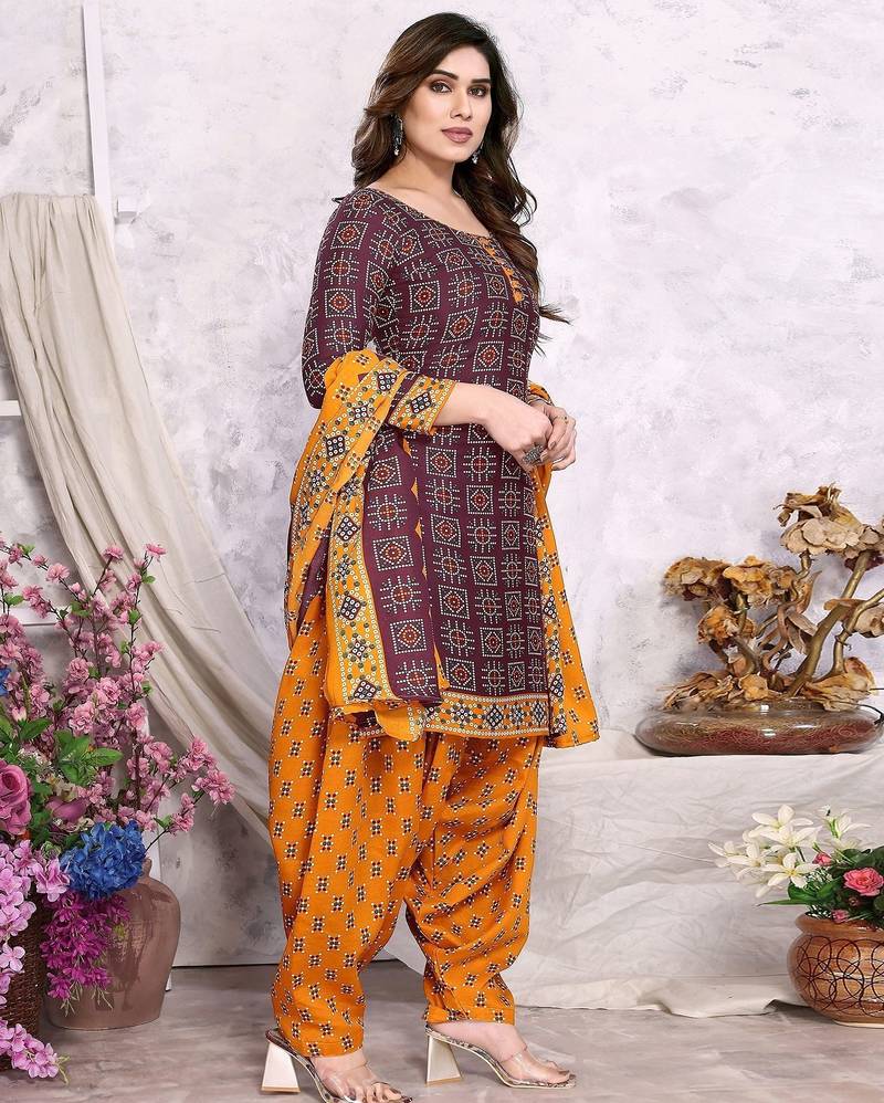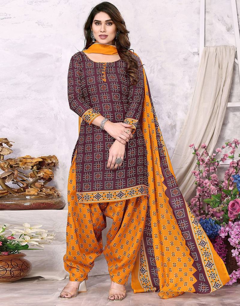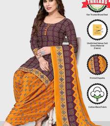 Unstitched printed cotton blend kurta & patiyala dress material with top, bottom & dupatta