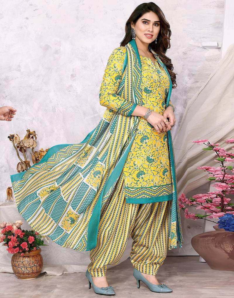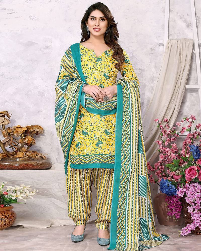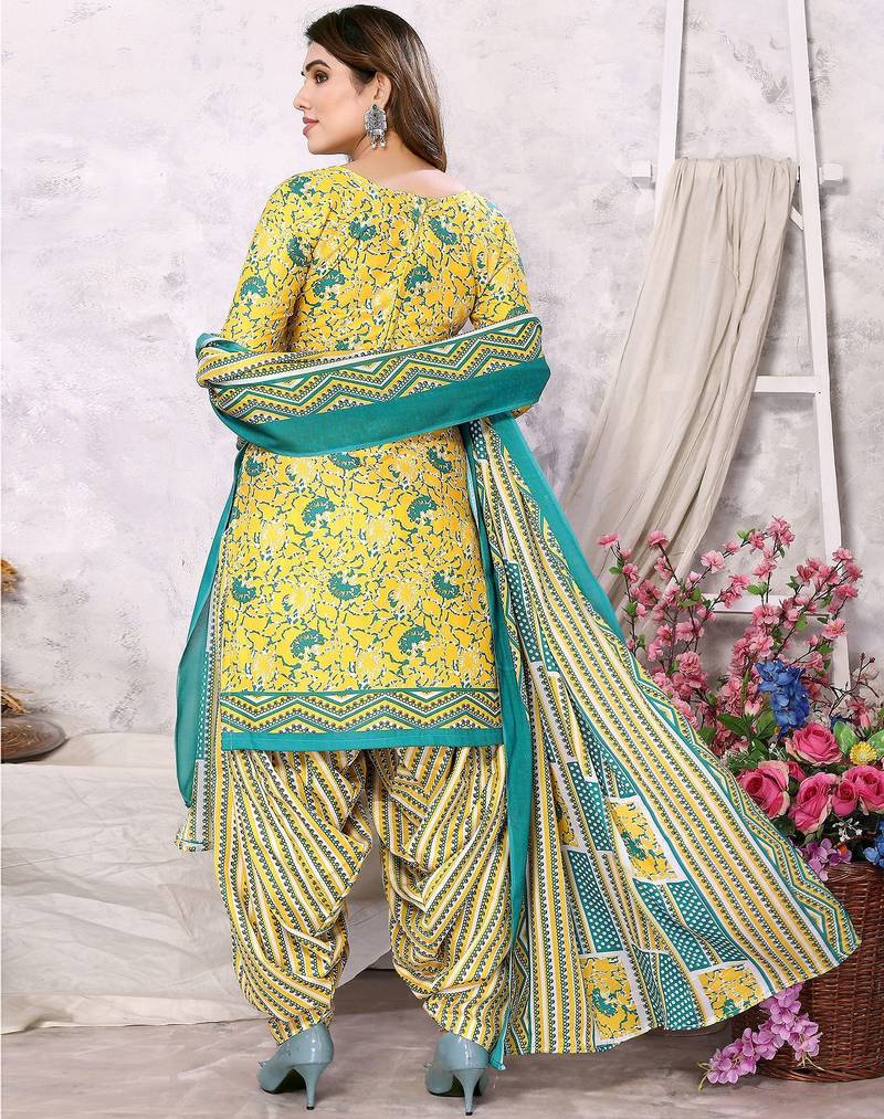 Unstitched printed cotton blend kurta & patiyala dress material with top, bottom & dupatta
