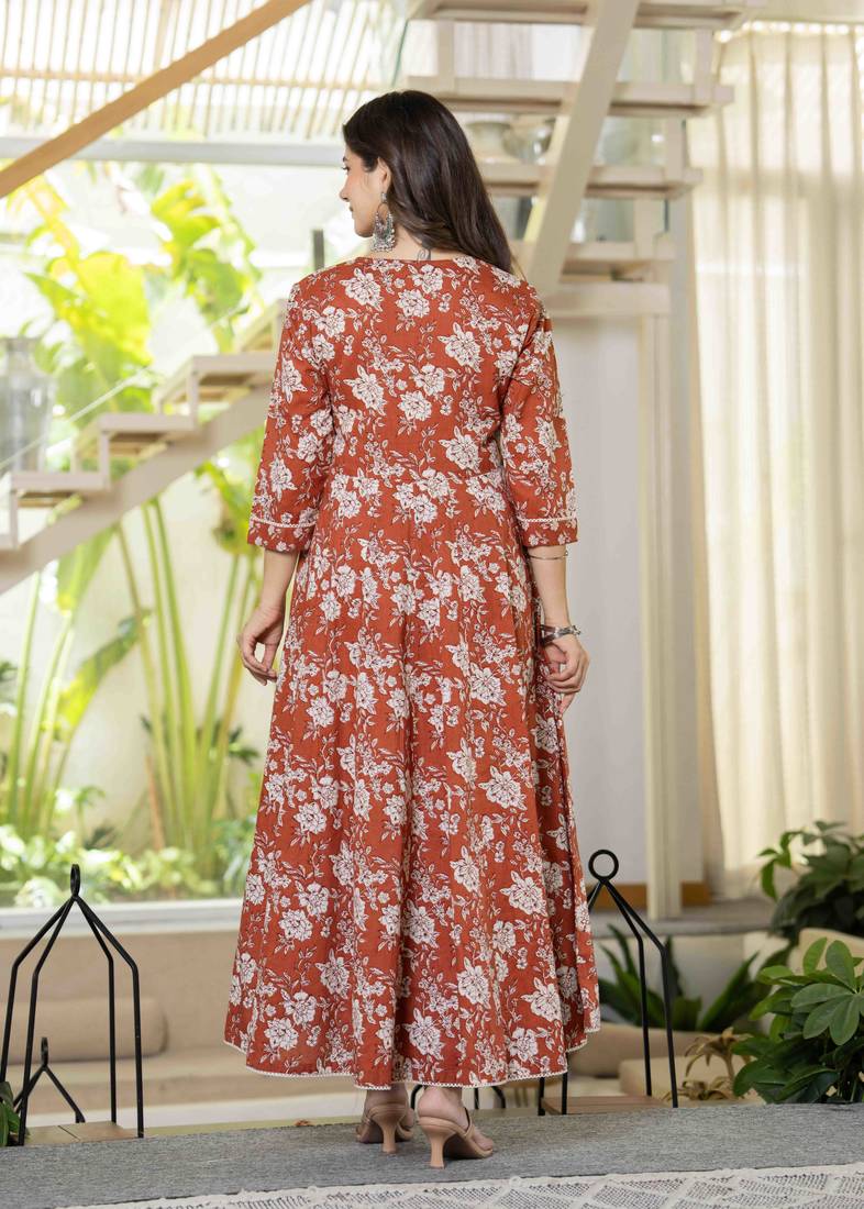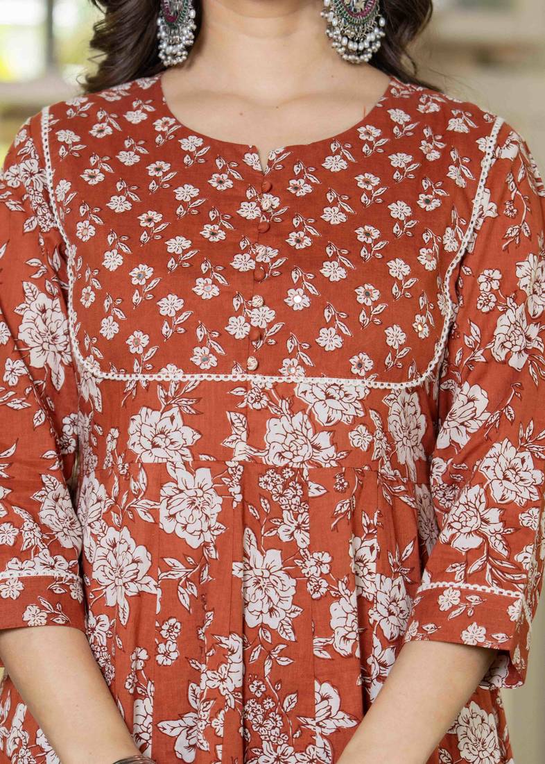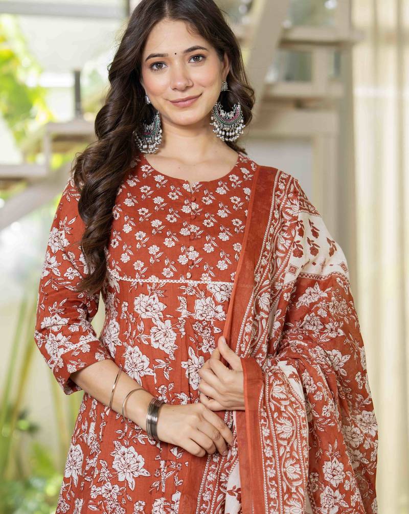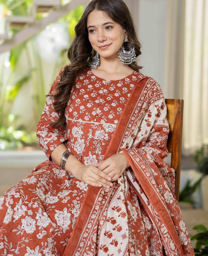 | Product Name | Women Cotton Printed Round Nack 3/4 Sleeves Calf Length Flared Kurta Pant And Dupatta Set | |