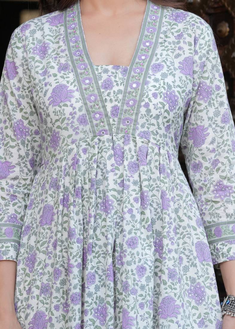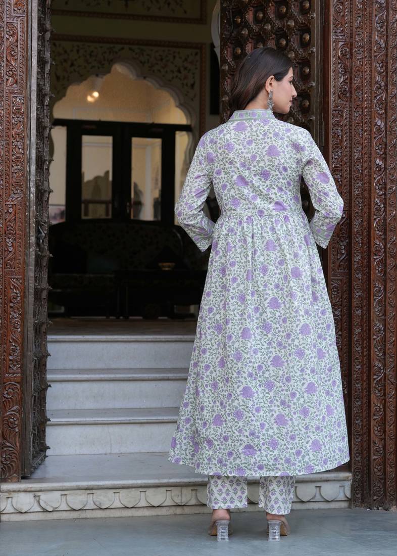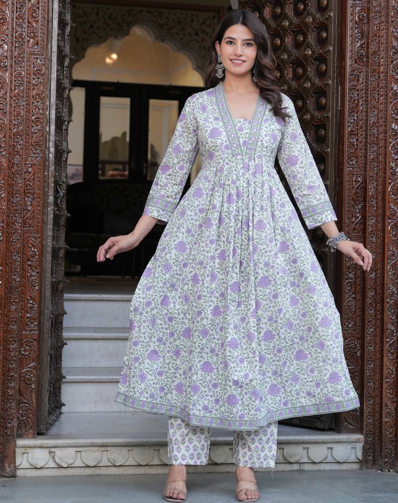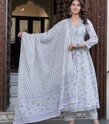| Product Name | Women Cotton Printed V Nack 3/4 Sleeves Calf Length Flared Kurta Pant And Dupatta Set | |