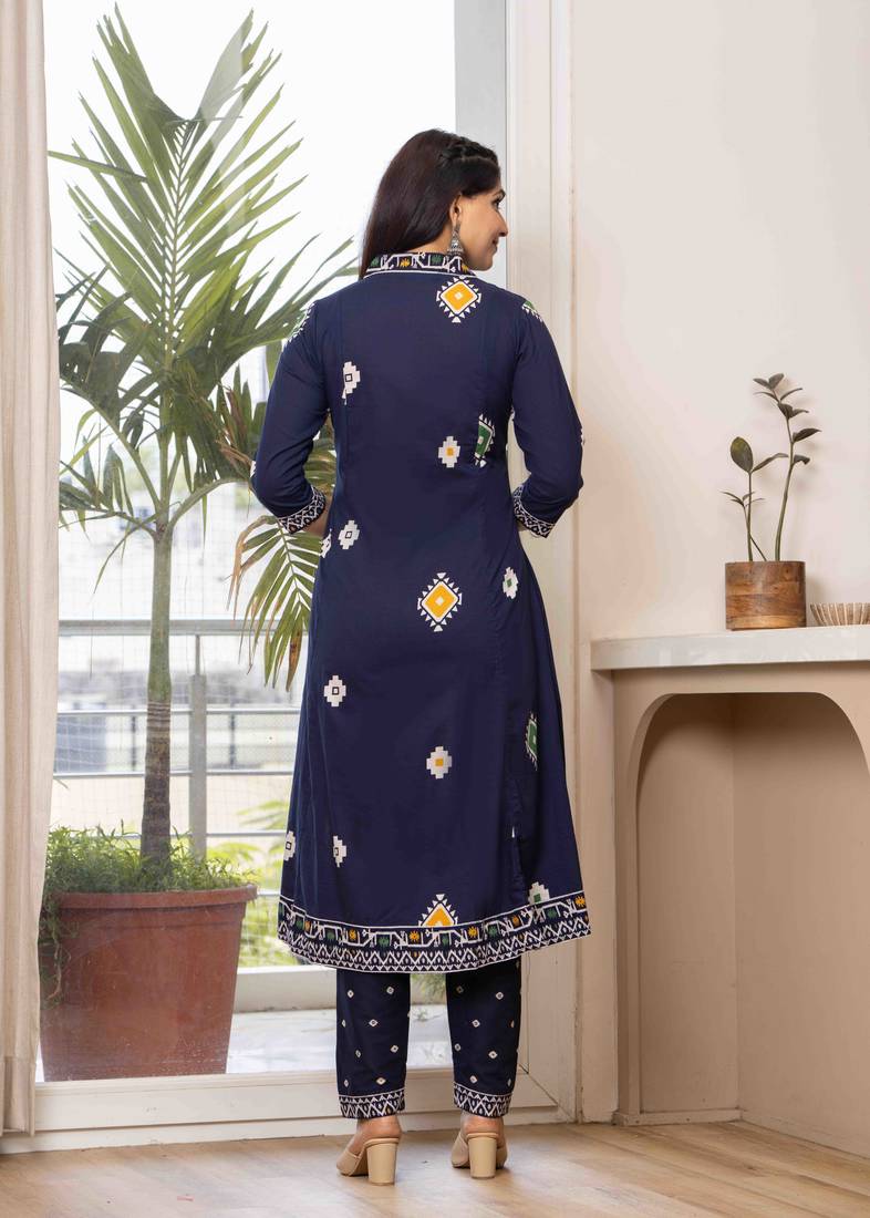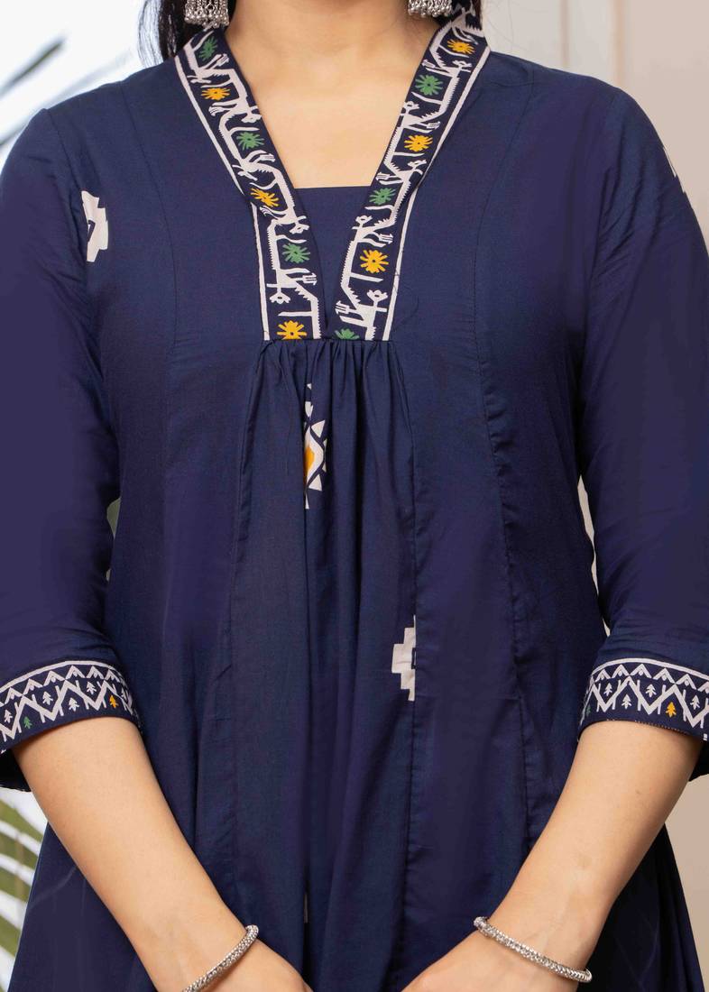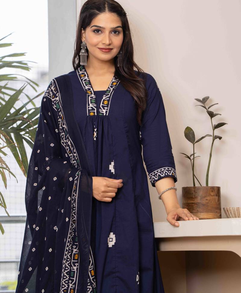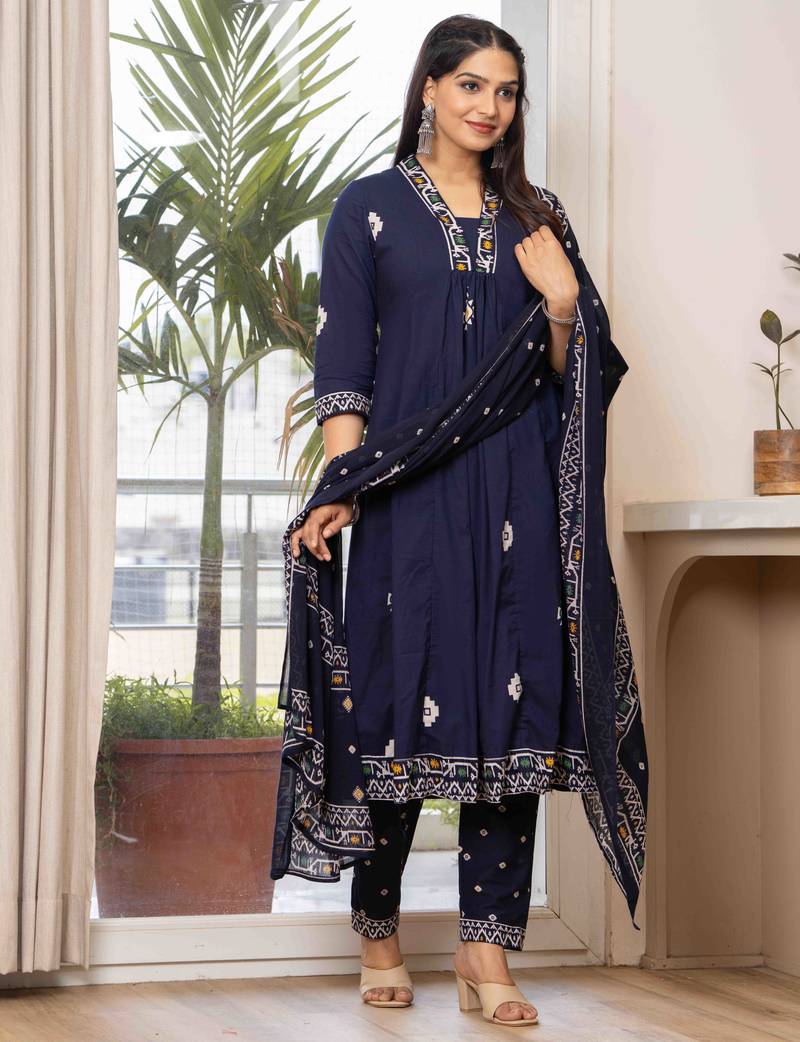 | Product Name | Women Cotton Printed V Nack 3/4 Sleeves Calf Length Flared Kurta Pant And Dupatta Set | |
