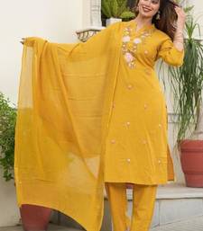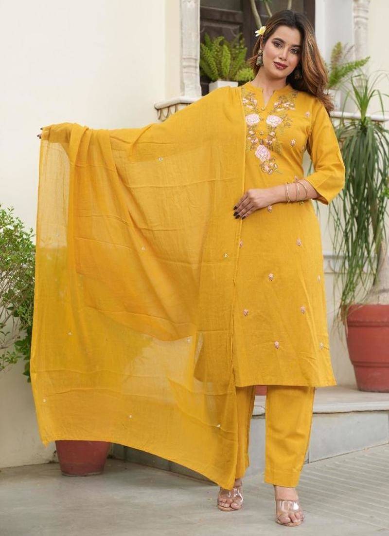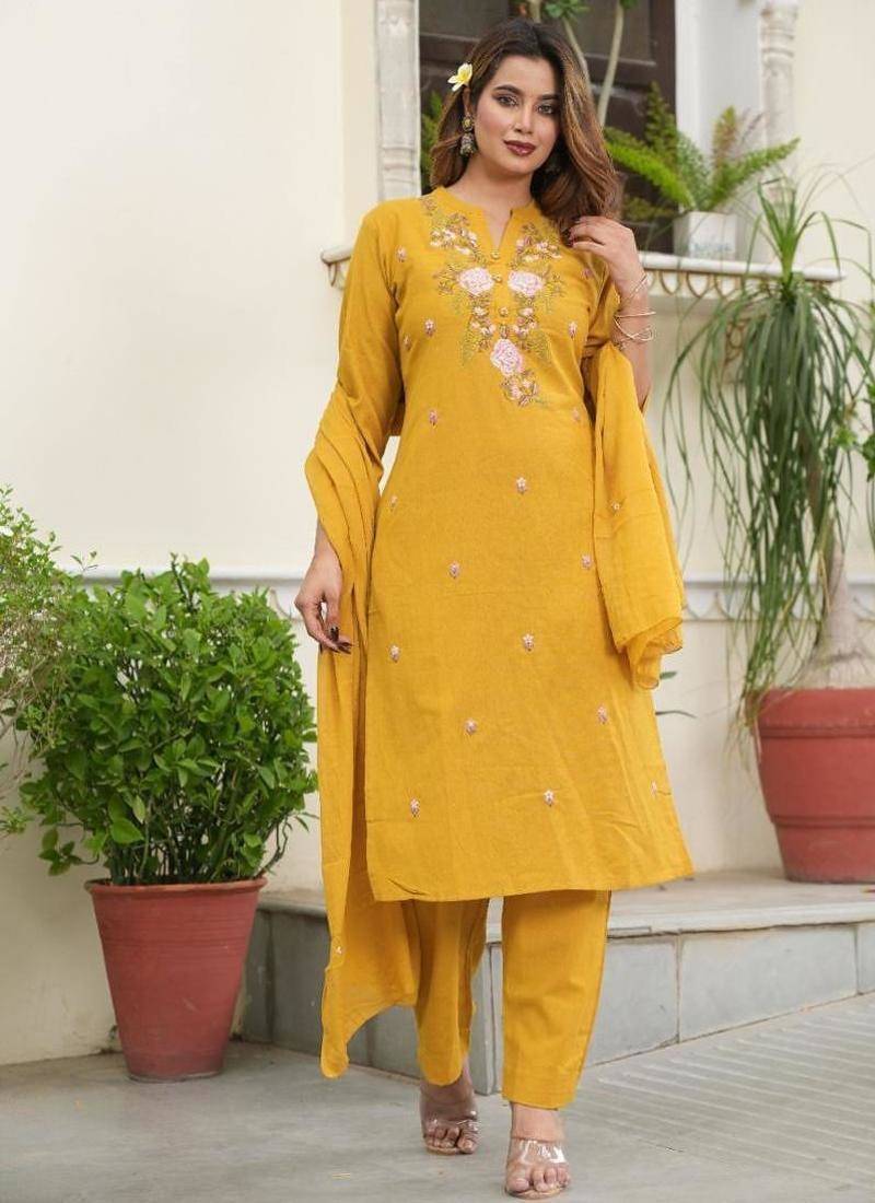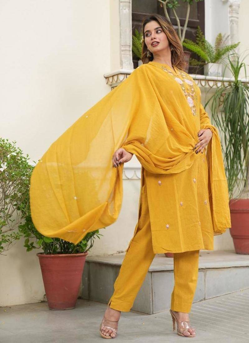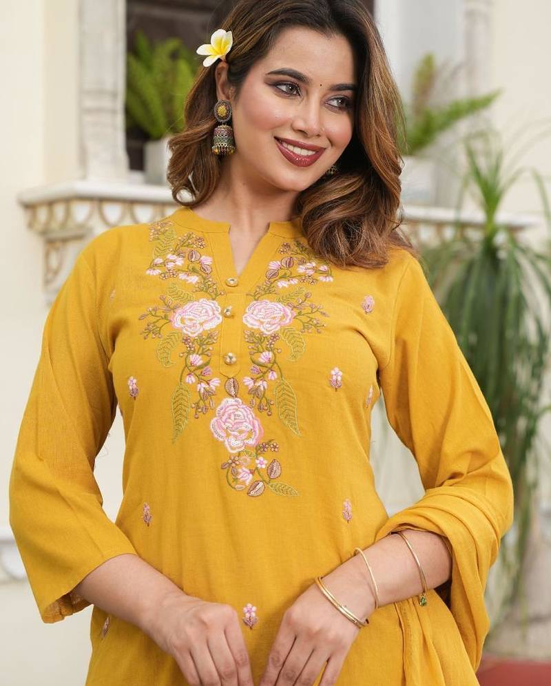 | Product Description | A Mustard Yellow Embroidered Kurta Set With A Matching Dupatta And Straight Leg Trousers. The Kurta Features Intricate Floral Thread Work Embroidery And Potential Mirror Work Accents Around The Neckline And Scattered On The Fabric And Dupatta. This Style Of Outfit Is Versatile And Often Worn For Festive Celebrations, Casual Outings, Office Wear, And Sometimes Weddings (E.G., Haldi Ceremonies). |
