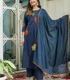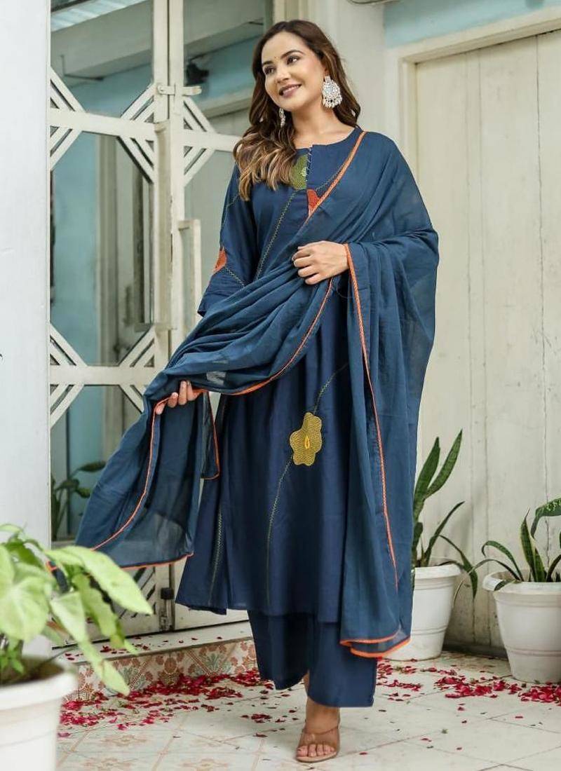 Beautiful jaipuri a navy blue cotton kurta, pant, and dupatta set with floral applique designs and orange piping.