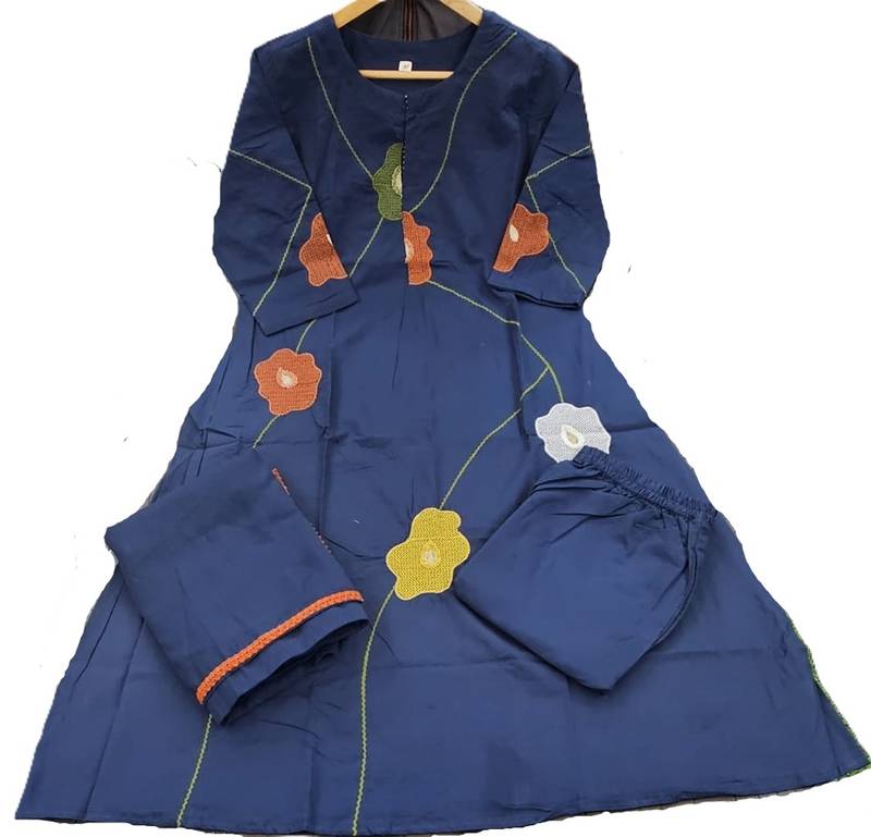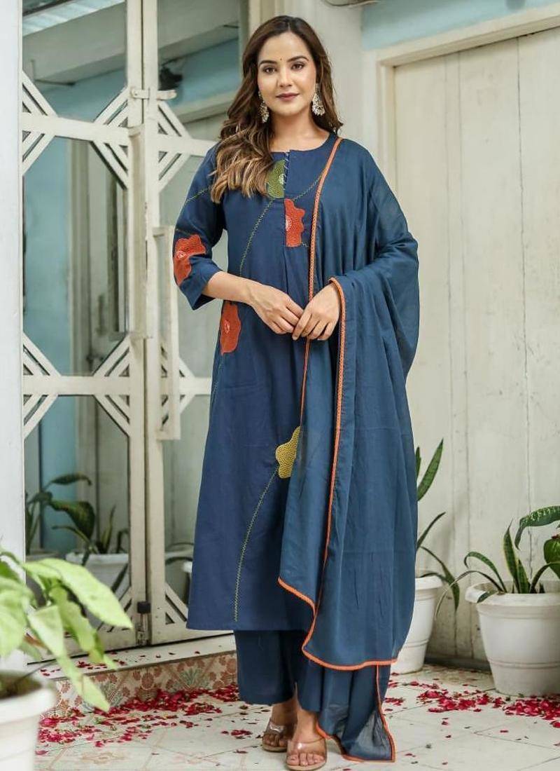 | Product Description | A Three Piece Garden Navy Blue Cotton Suit Set Featuring Floral Appliqués And Orange Piping, A Popular Style Of Women's Ethnic Wear In India. The Set Is Primarily Garden Navy Blue Color And Is Typically Made From High Quality Fabrics Cotton , Known For Being Soft, Breathable, And Suitable For Daily Wear. |