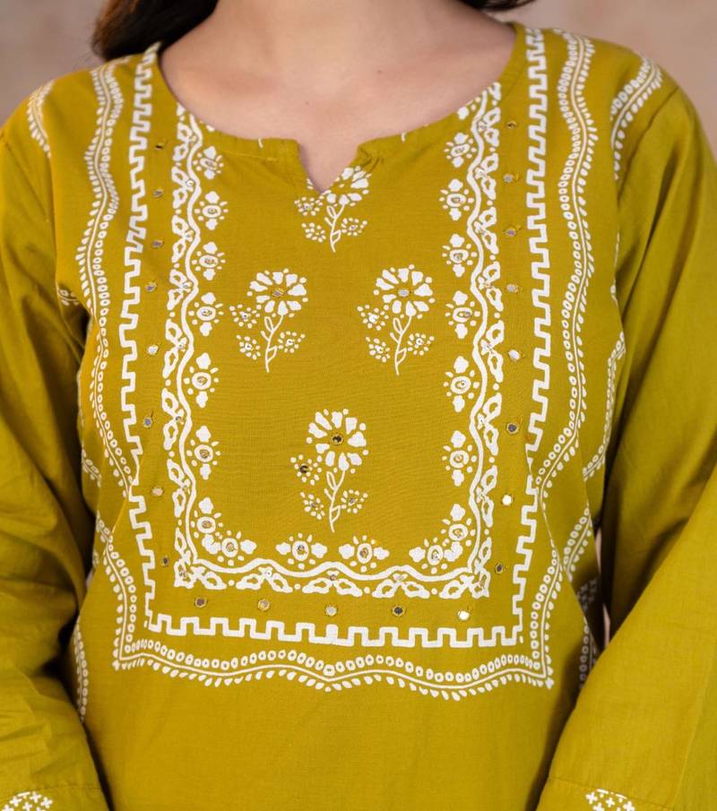 | Product Description | A Yellow Cotton Kurta Set Features A Straight Cut Silhouette With Intricate White Floral And Geometric Discharge Prints. |