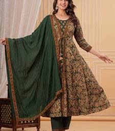 Green printed anarkali kurta set with a matching dupatta and pants.