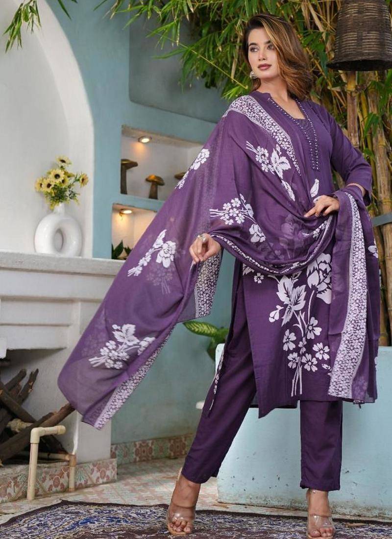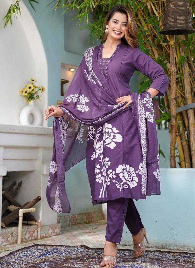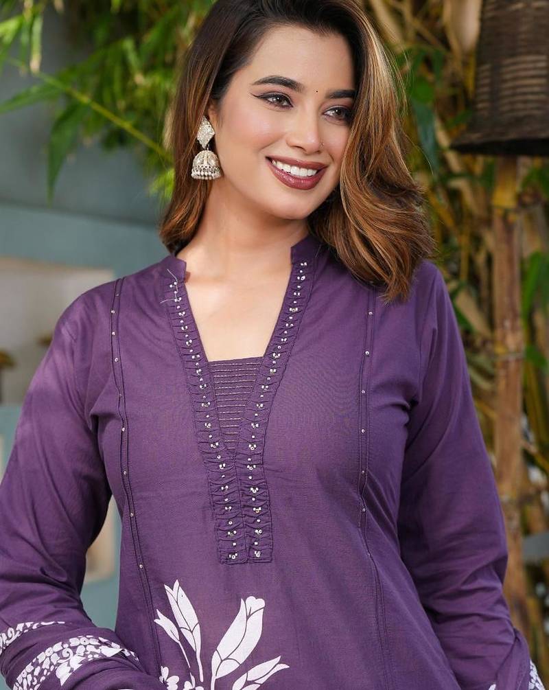 | Product Description | The Kurta Features White Floral Motifs Against A Rich Purple Background, A V Neckline With Piping Detail, Three Quarter Length Sleeves, And Side Slits. The Set Often Comes In A Straight Silhouette And Includes Solid Or Printed Trousers And A Matching Printed Voile Dupatta. Material Is In Breathable And Comfortable Pure Cotton Fabric. This Versatile Style Is Suitable For A Range Of Occasions, From Casual Daily Wear To Festive Gatherings. |