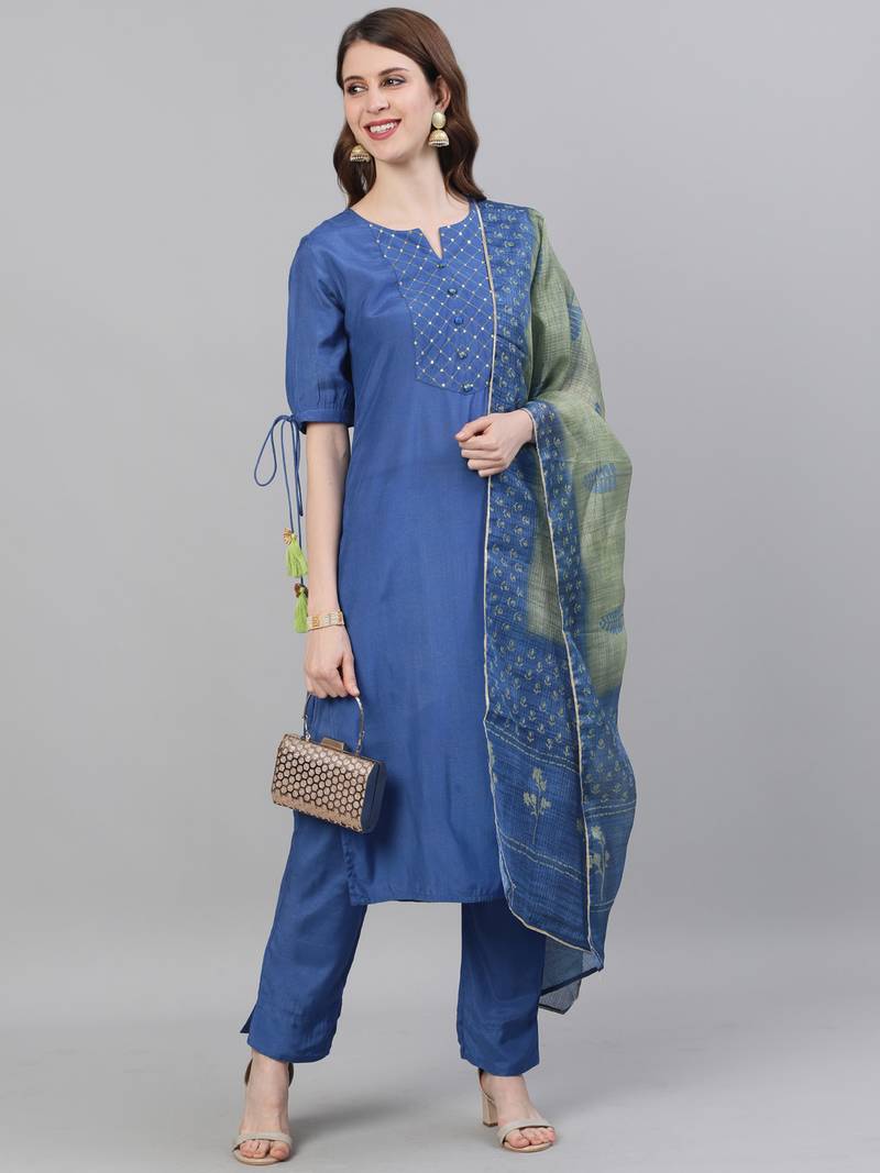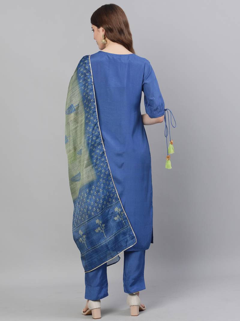 | Product Description | Jaipur Kurti Blue Embroidered Straight Kurta With Round Neck, Half Sleeve With Tassel Detail, Side Slit Blue Solid Pant Elasticated Waistband, Slip On Closure,Side Pockets